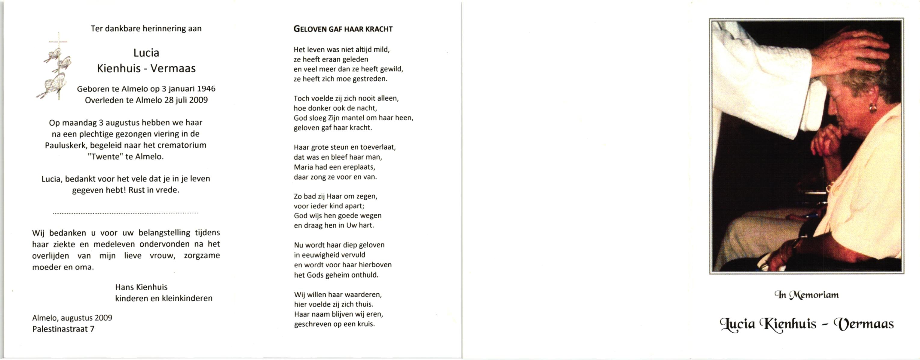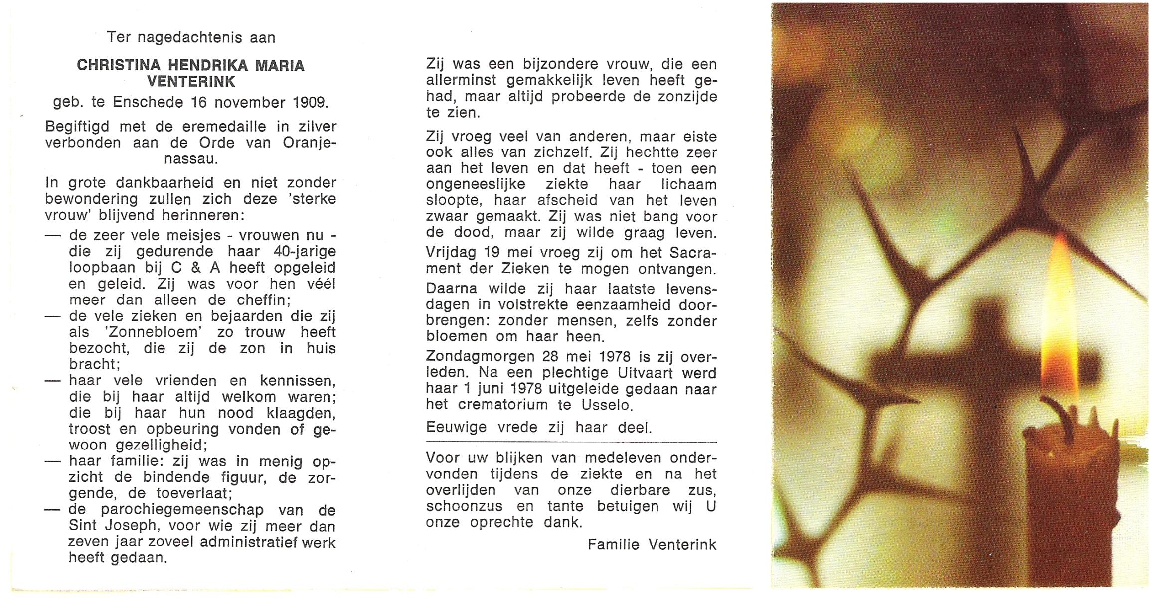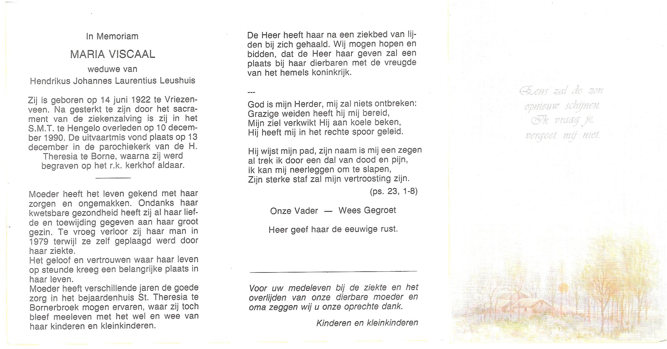 VISCAAL, Maria, geboren op 14-6-1922 te Vriezenveen, overleden op 10-12-1990 te Hengelo (Ov.) op 78-jarige leeftijd, begraven op 13-12-1990 te Borne.