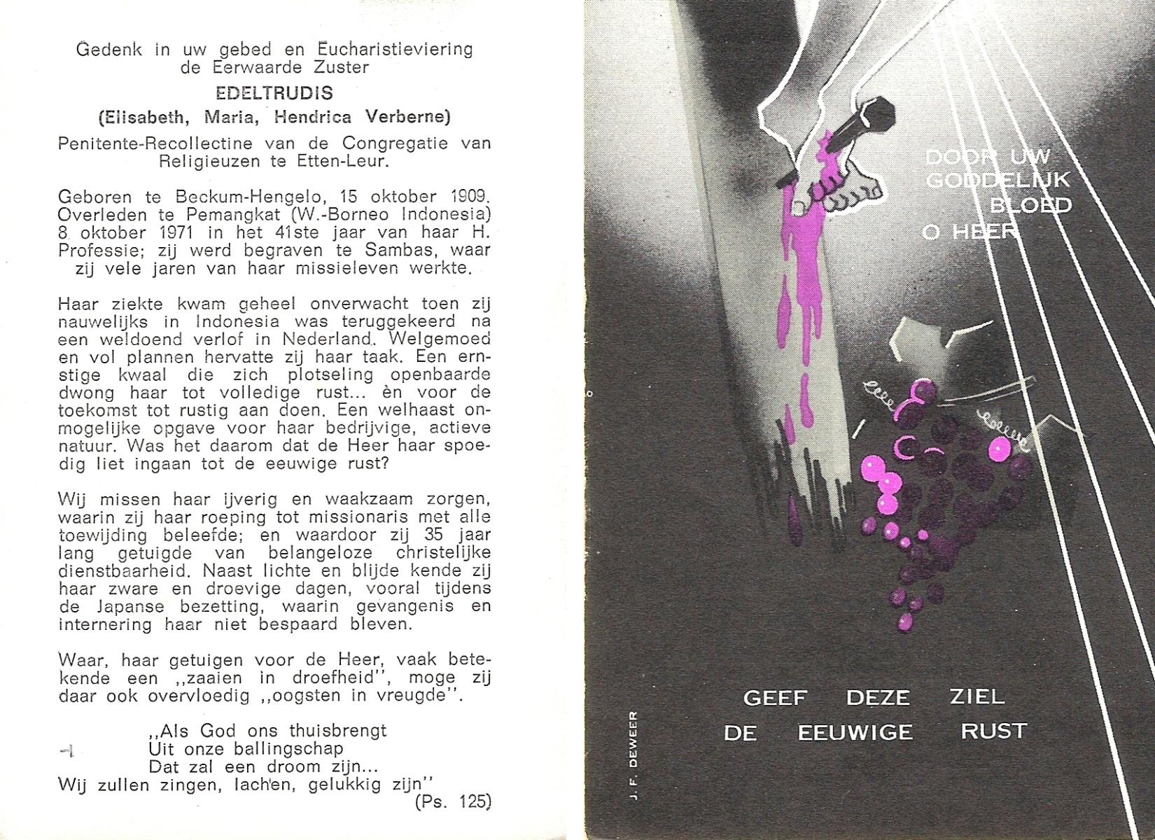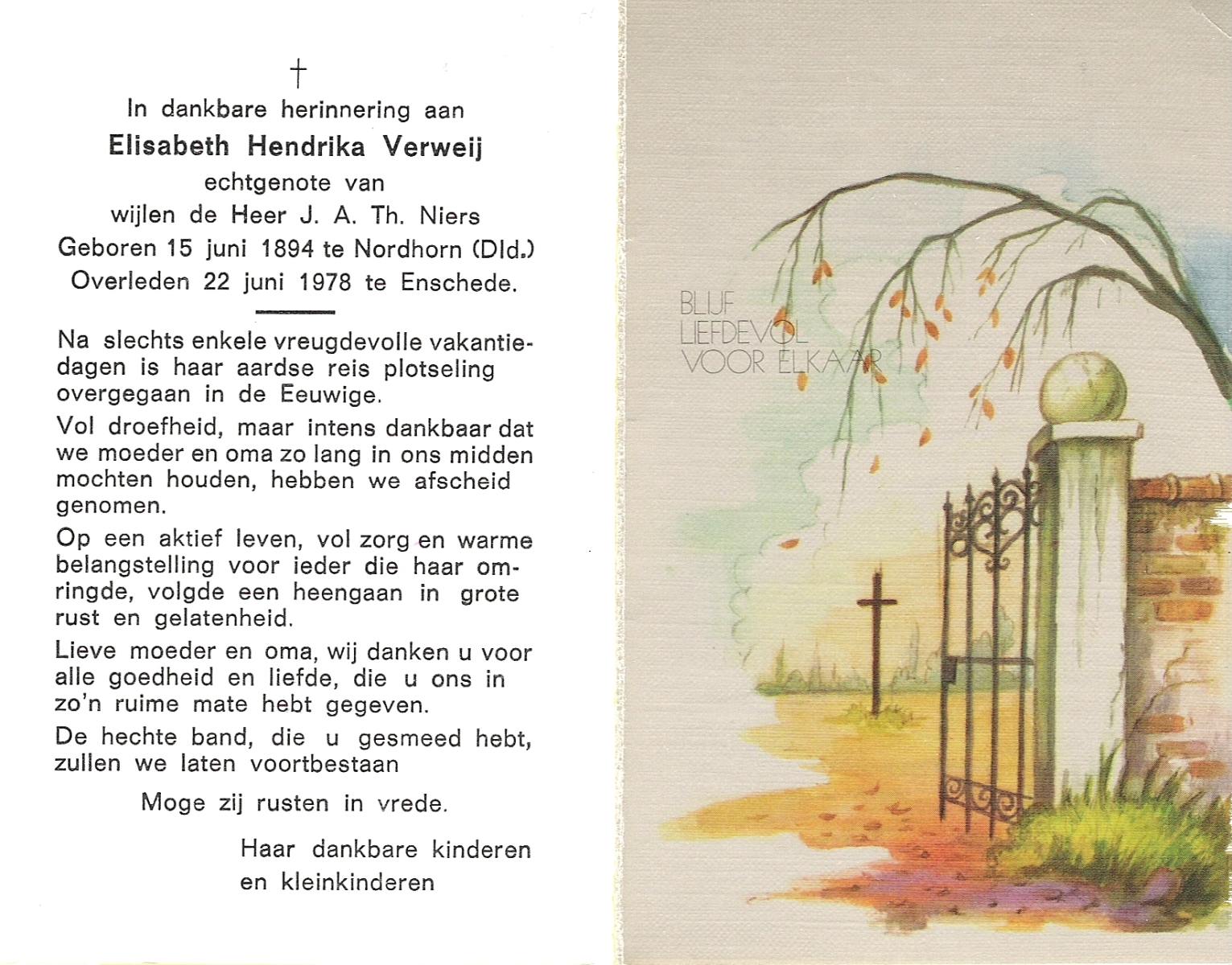 VERWEIJ, Elisabeth Hendrika, geboren op 15-06-1894 te Nordhorn (Dld.), overleden op 22-6-1978 te Enschede op 84-jarige leeftijd.