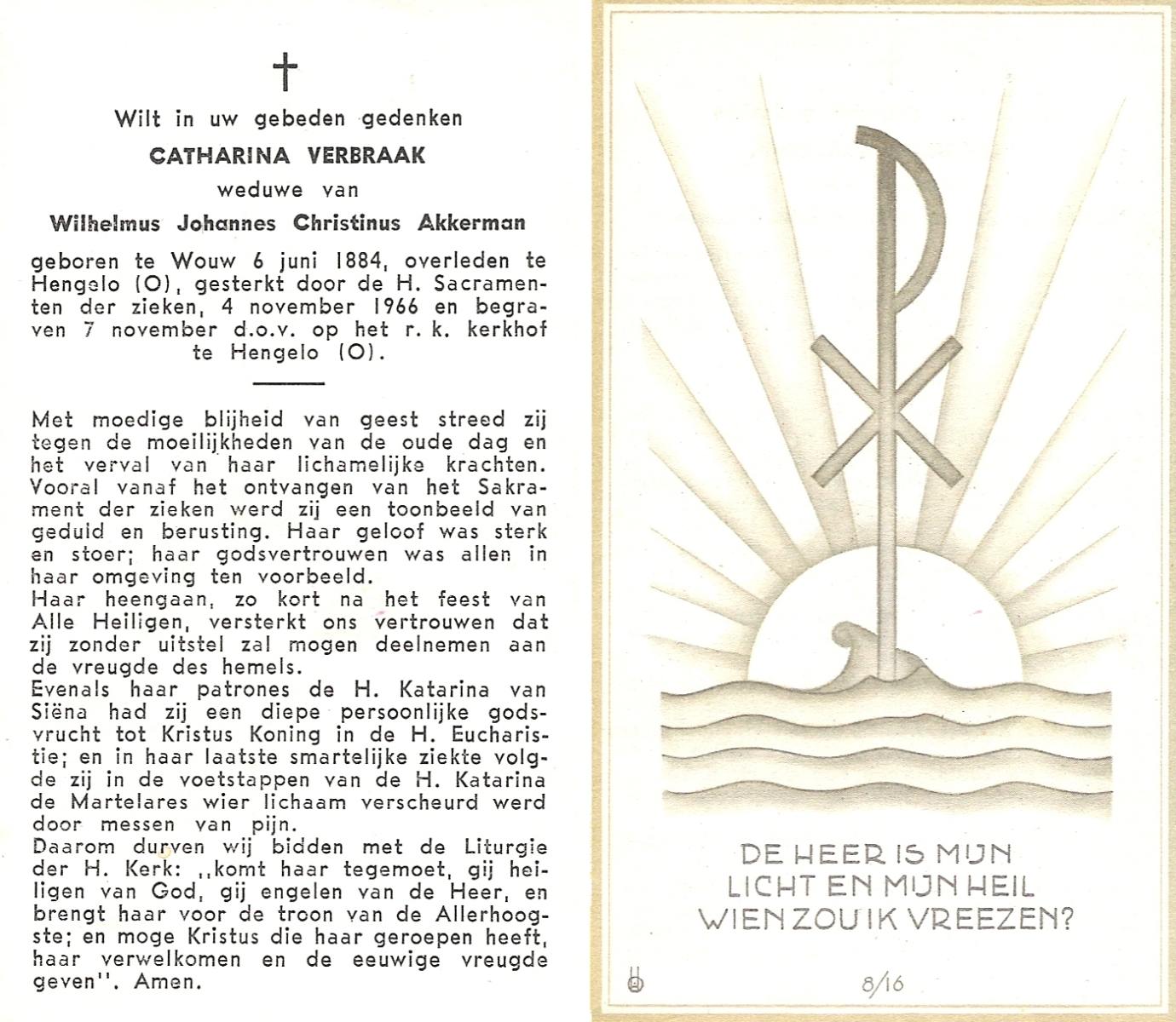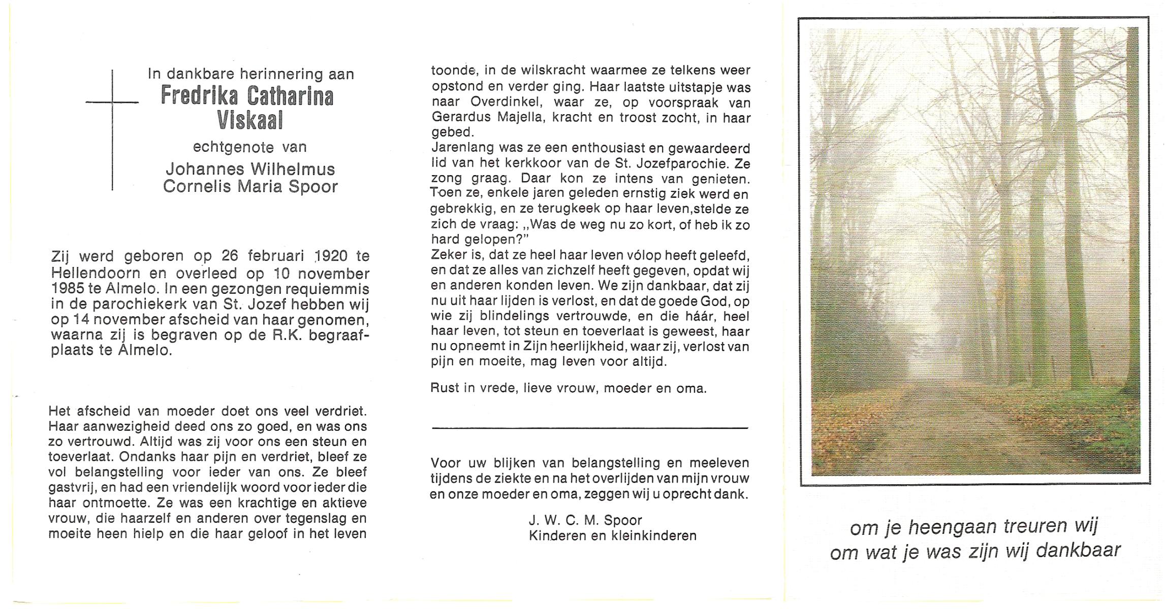 VISKAAL, Fredrika Catharina, geboren op 26-2-1920 te Hellendoorn, overleden op 10-11-1985 te Almelo op 65-jarige leeftijd, begraven op 14-11-1985 te Almelo.