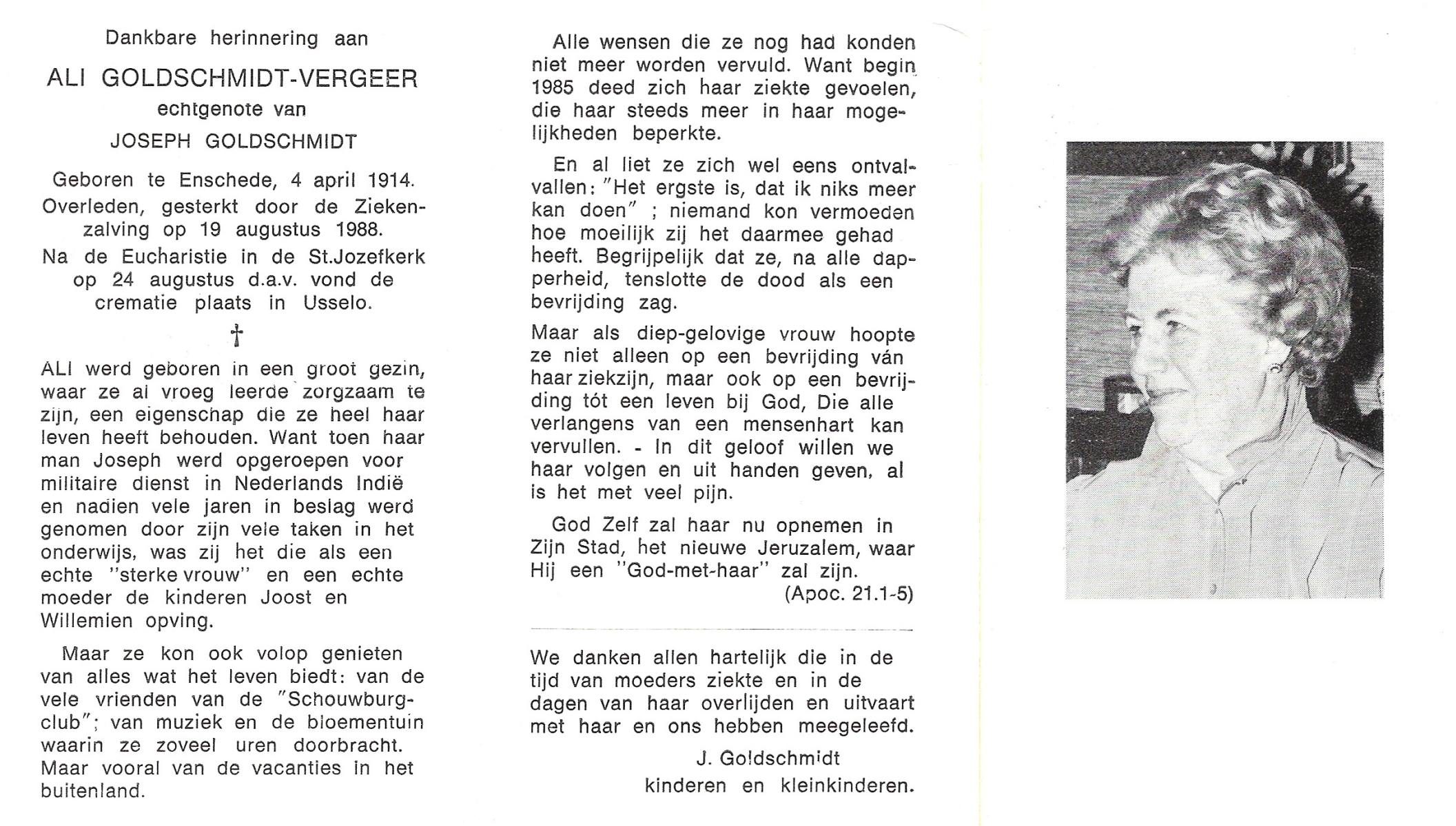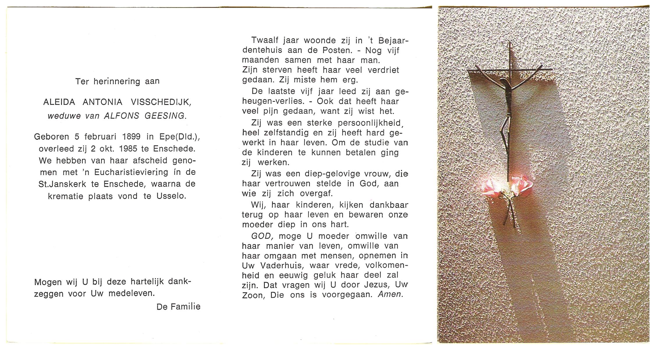 VISSCHEDIJK, Aleida Antonia, geboren op 05-02-1899 te Epe (Dld), overleden op 2-10-1985 te Enschede op 86-jarige leeftijd, gecremeerd te Usselo.