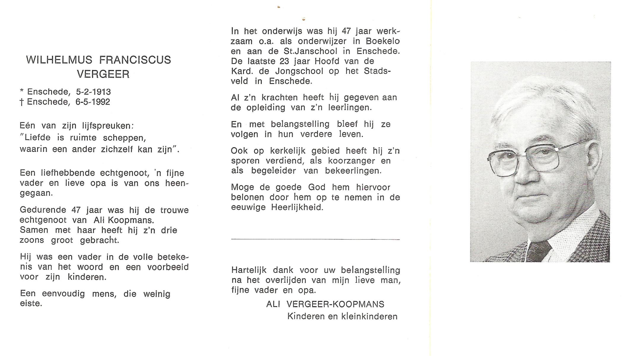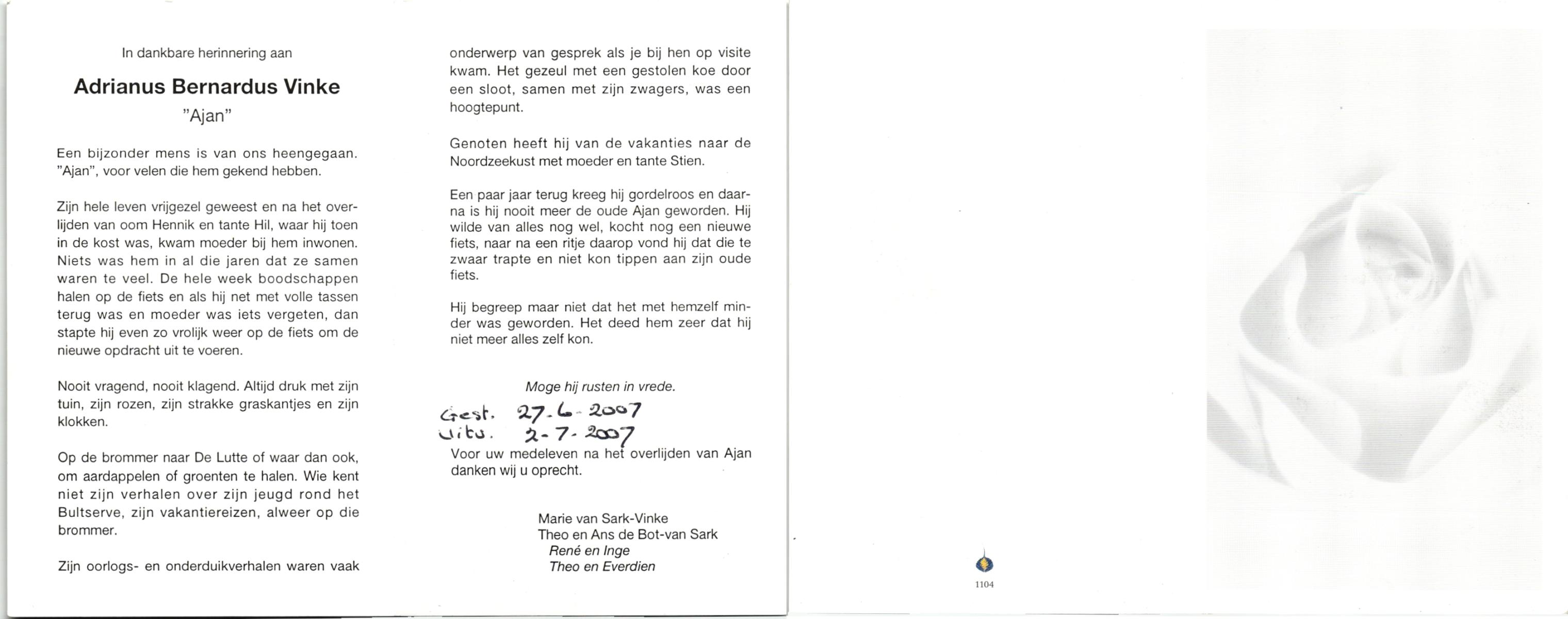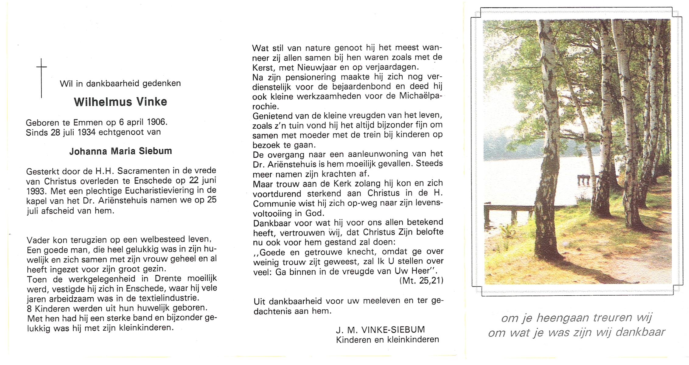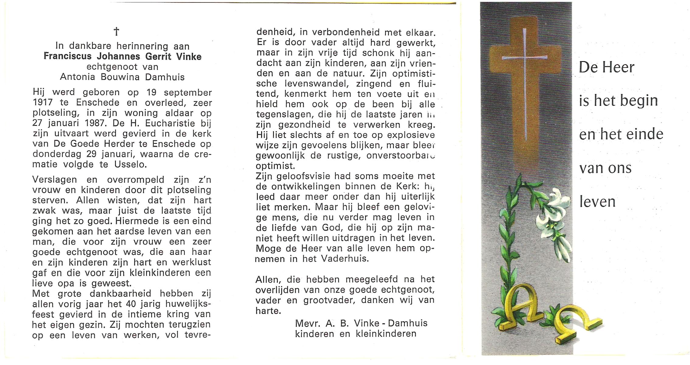 VINKE, Franciscus Johannes Gerrit, geboren op 19-9-1917 te Enschede, overleden op 27-1-1987 te Enschede op 69-jarige leeftijd, gecremeerd op 29-1-1987 te Usselo.
