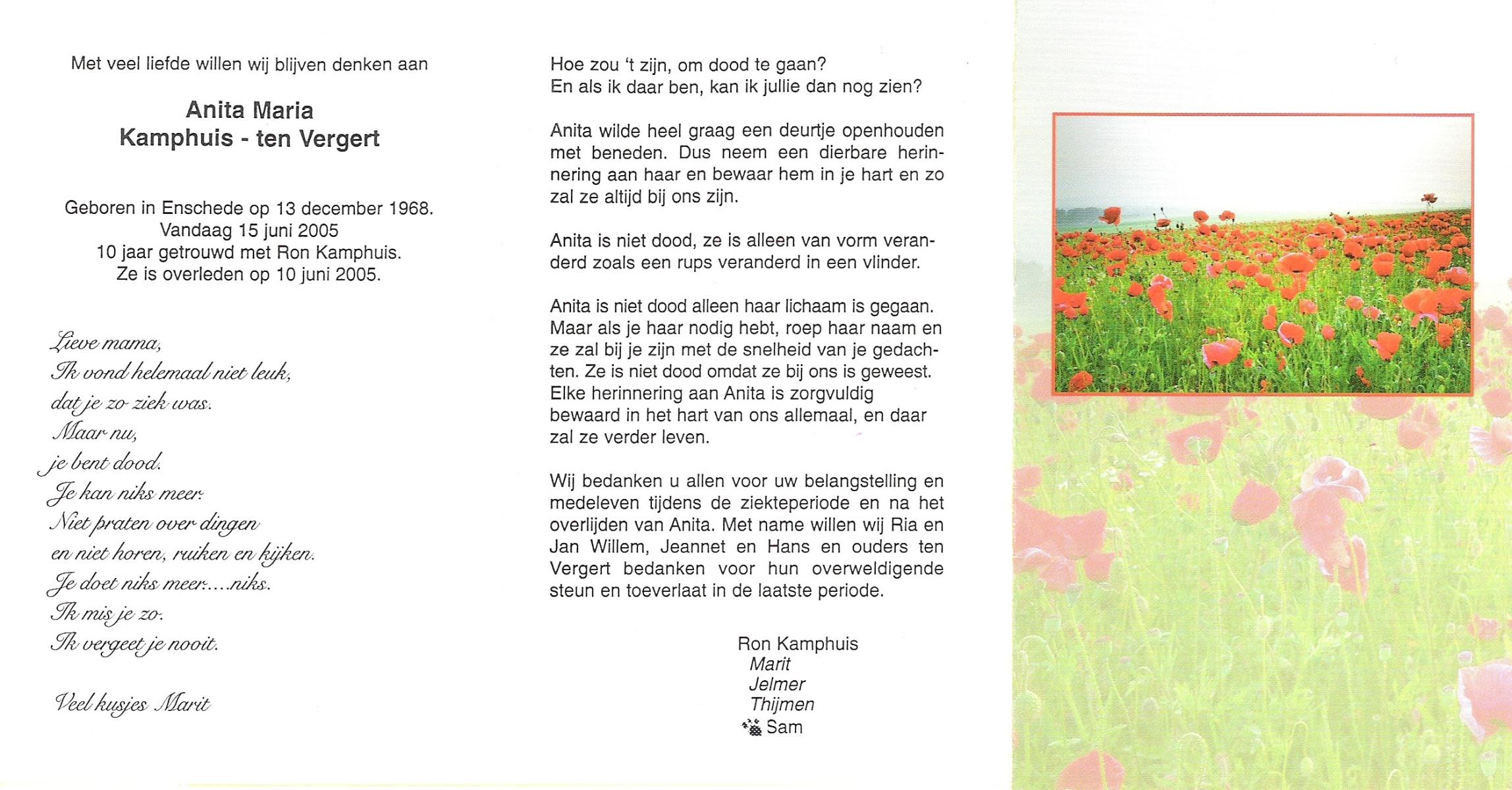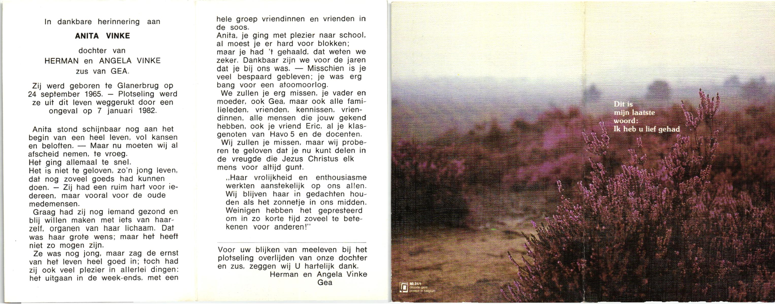 VINKE, , Anita, geboren op 24-9-1965, overleden op 7-1-1982 op 16-jarige leeftijd.