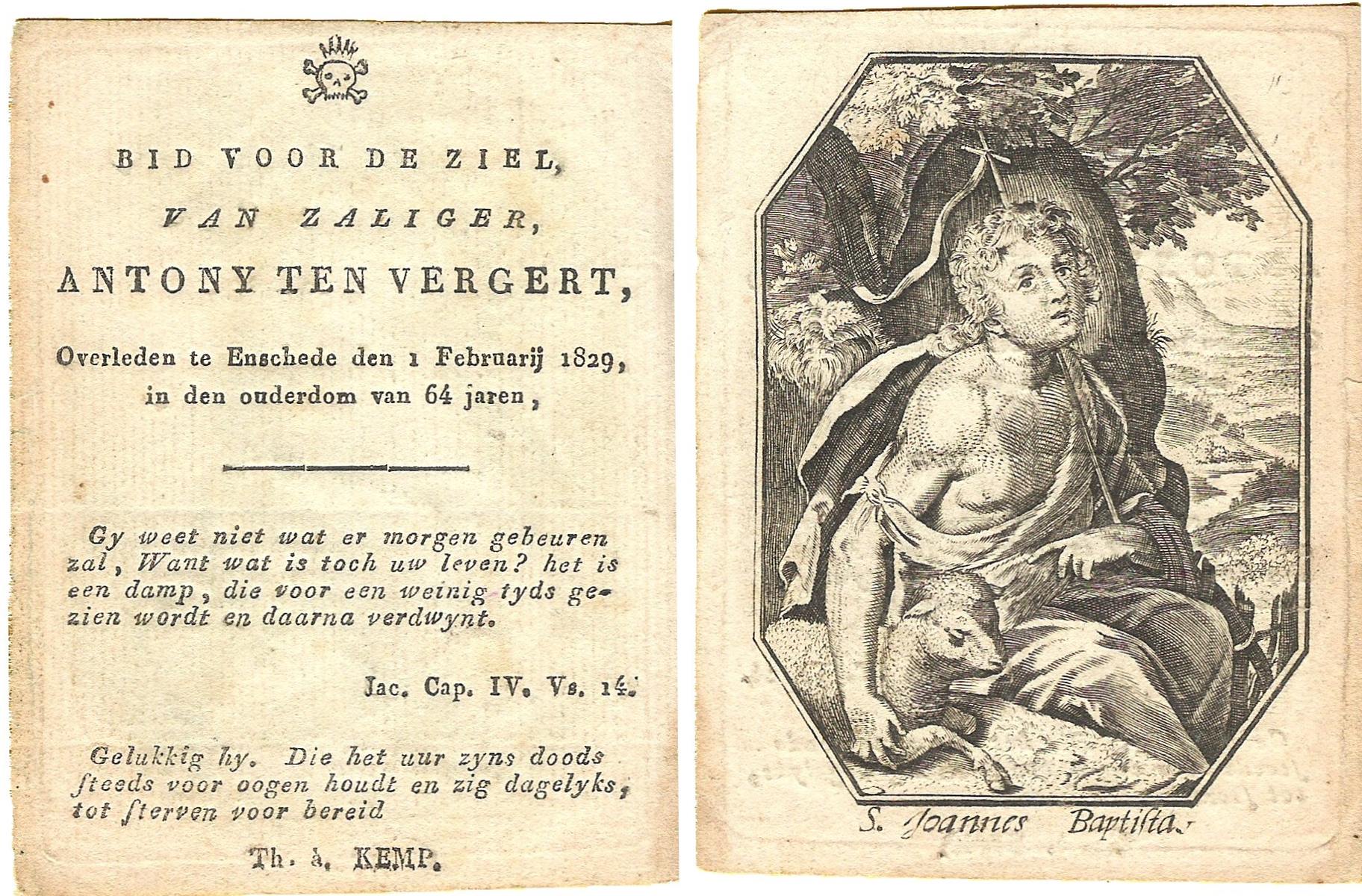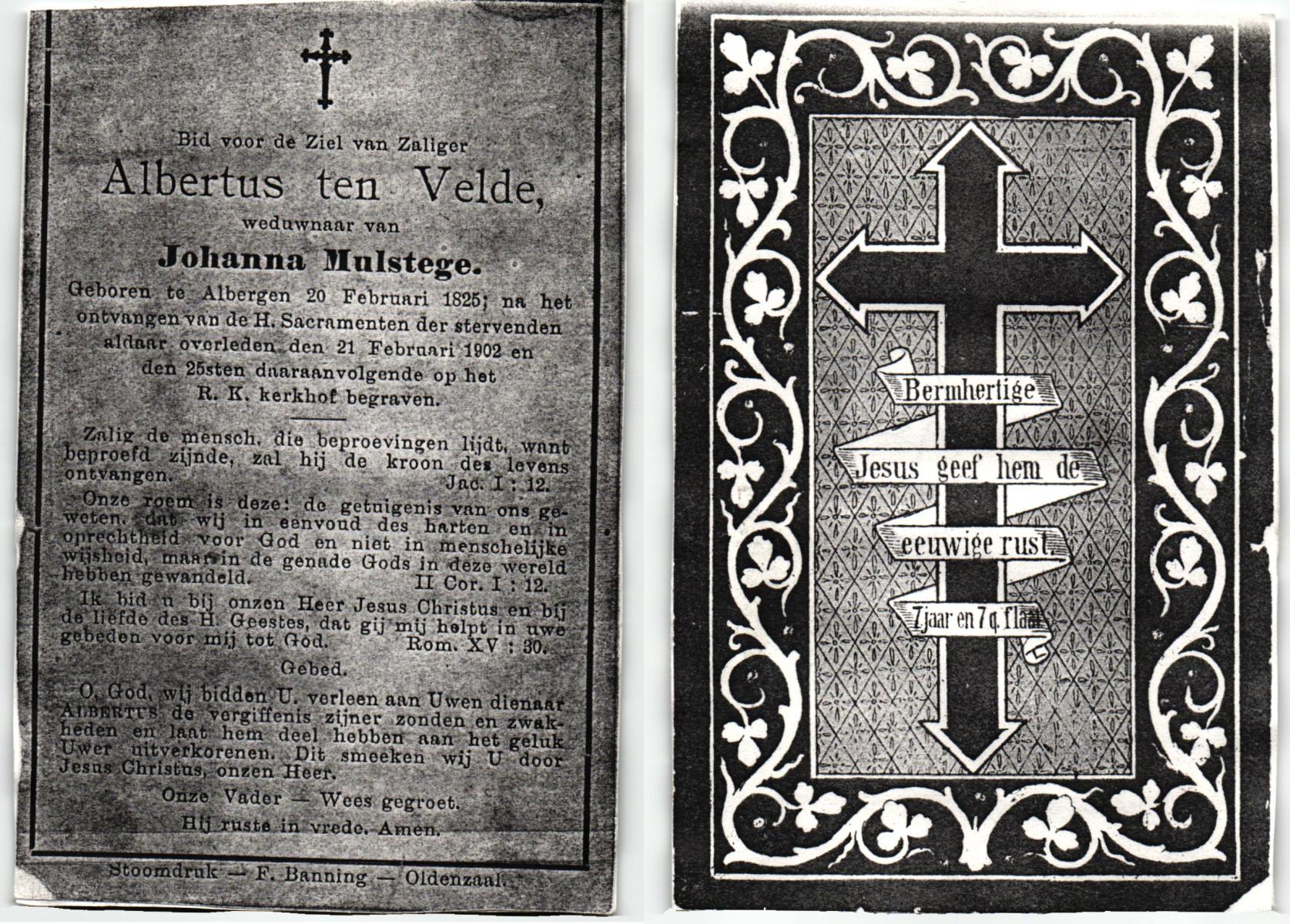VELDE, ten, Albertus, geboren op 20-02-1825 te Albergen, overleden op 21-2-1902 te Albergen op 78-jarige leeftijd, begraven op 25-2-1902 te Albergen.