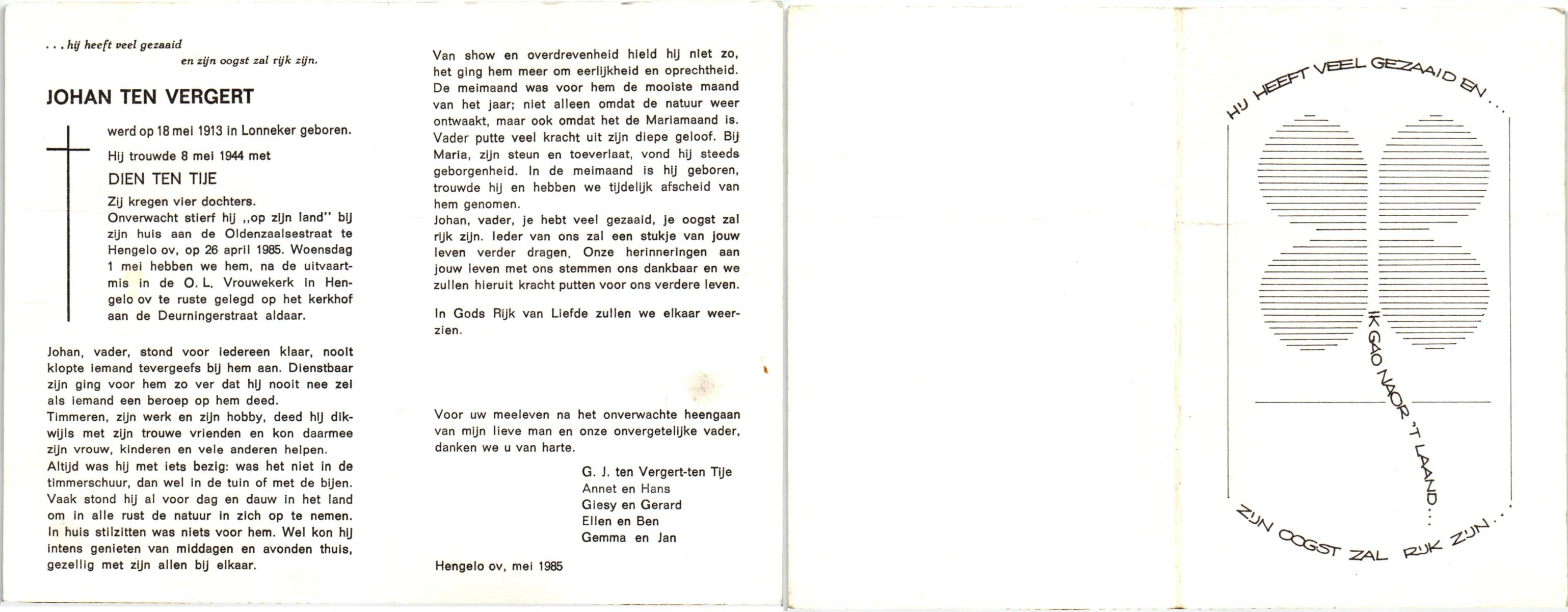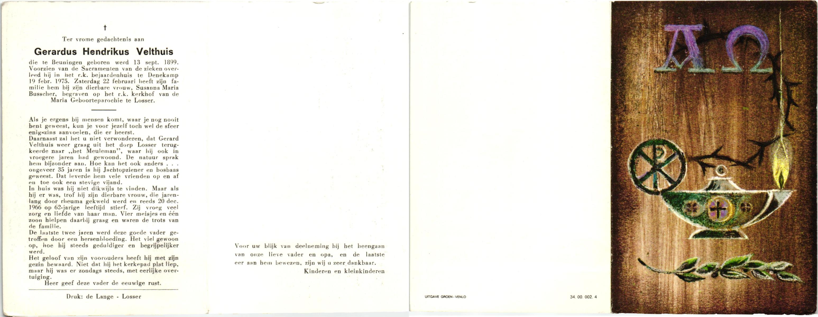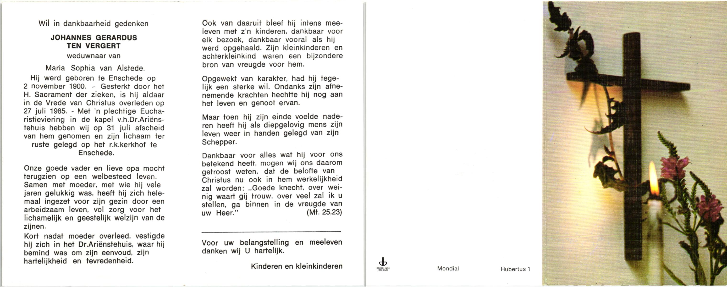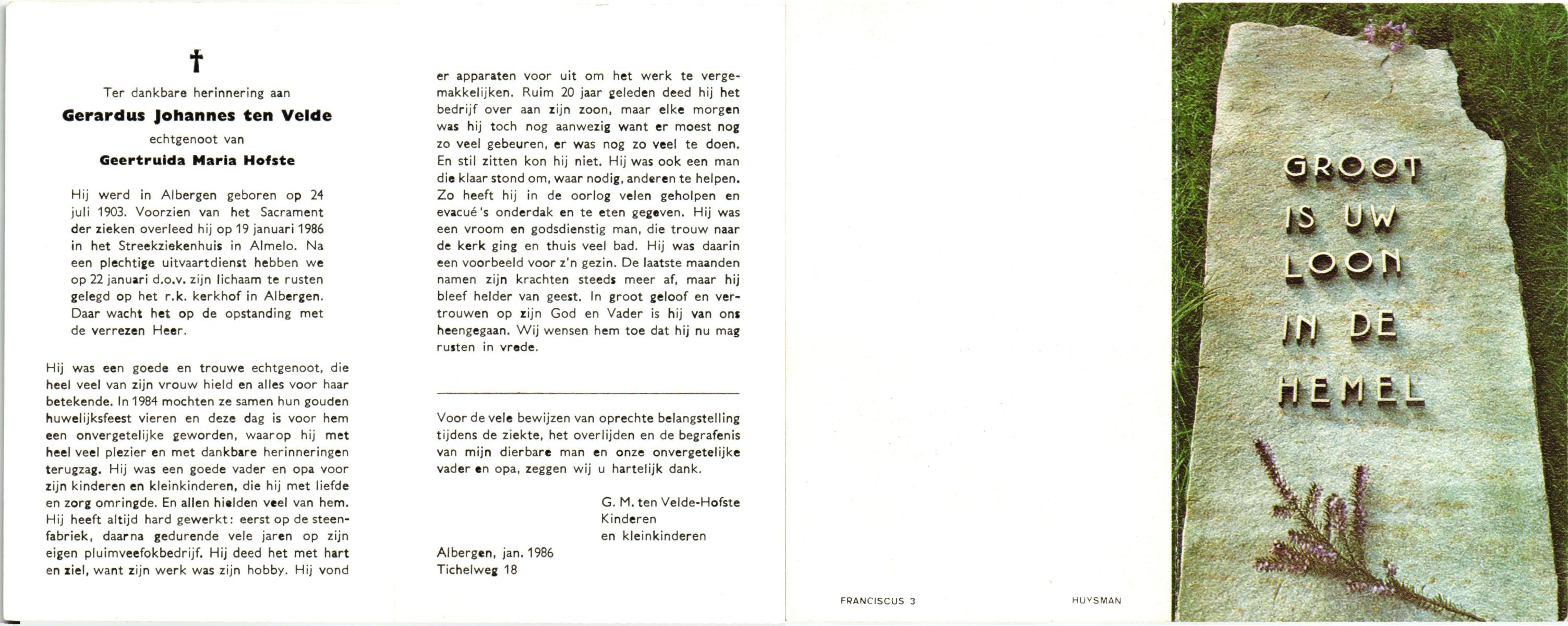 VELDE, ten, Gerardus Johannes, geboren op 24-7-1903 te Albergen, overleden op 19-1-1986 te Almelo, ziekenhuis op 82-jarige leeftijd, begraven op 22-1-1986 te Albergen.