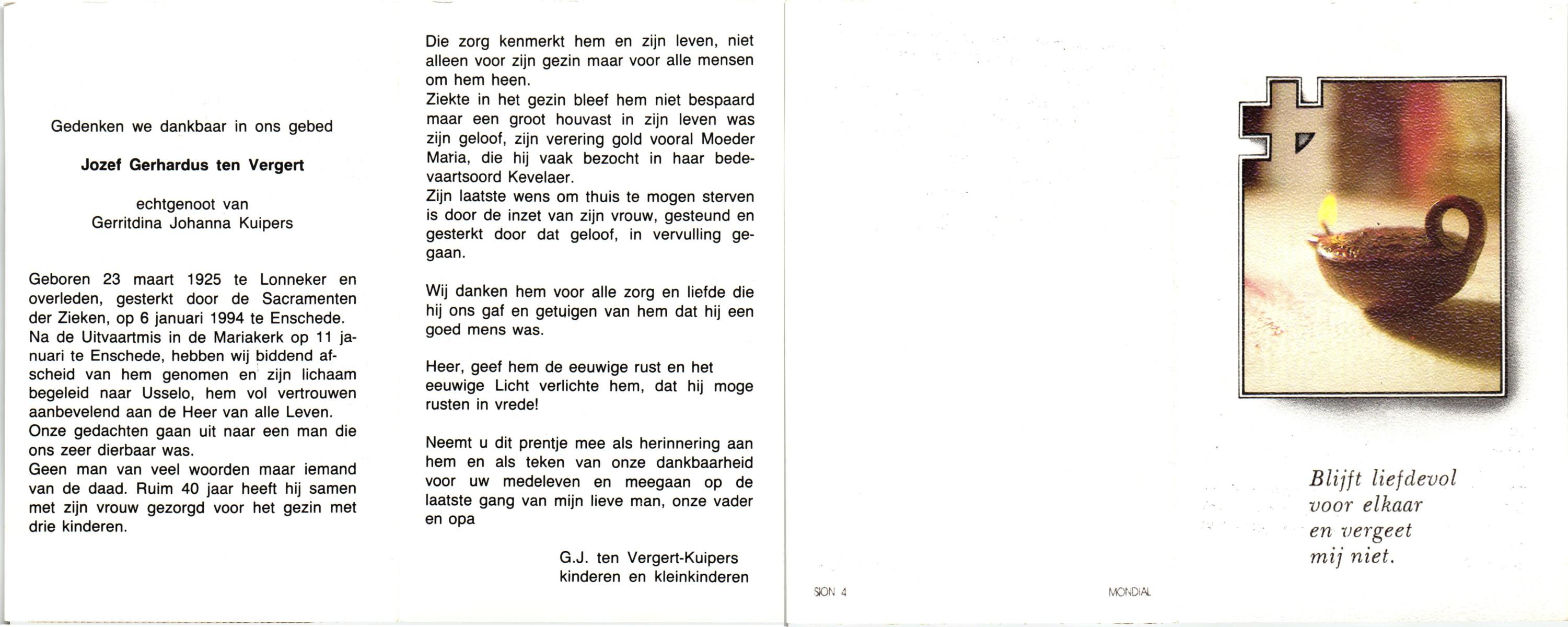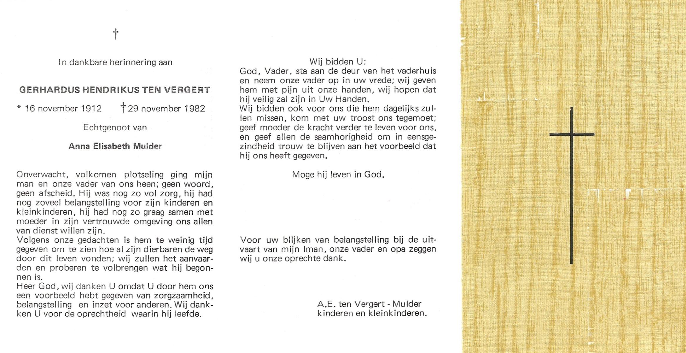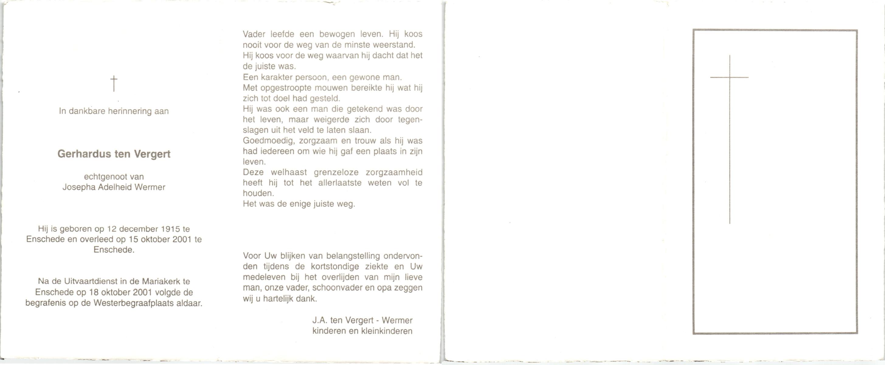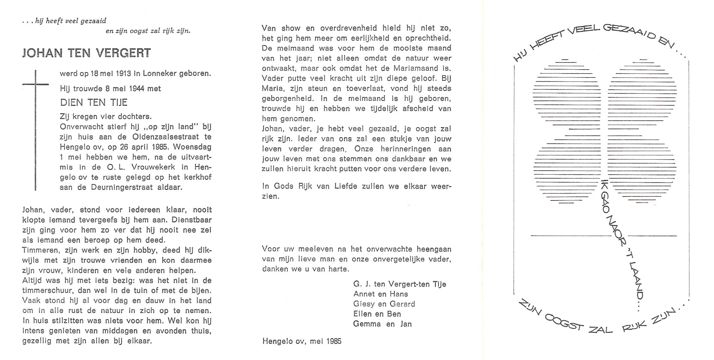 VELDE, ten, Gerardus Johannes, geboren op 24-7-1903 te Albergen, overleden op 19-1-1986 te Almelo, ziekenhuis op 82-jarige leeftijd, begraven op 22-1-1986 te Albergen.