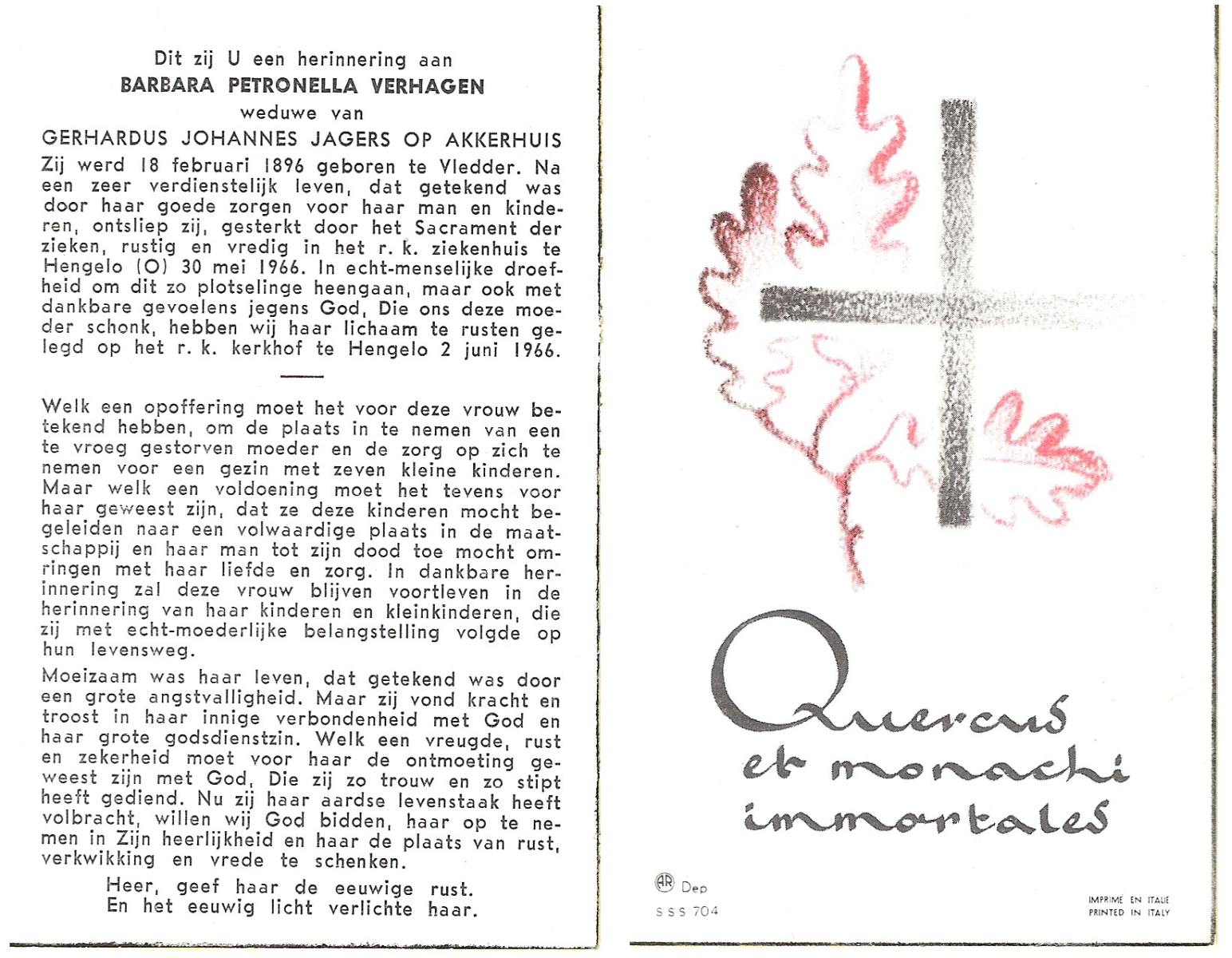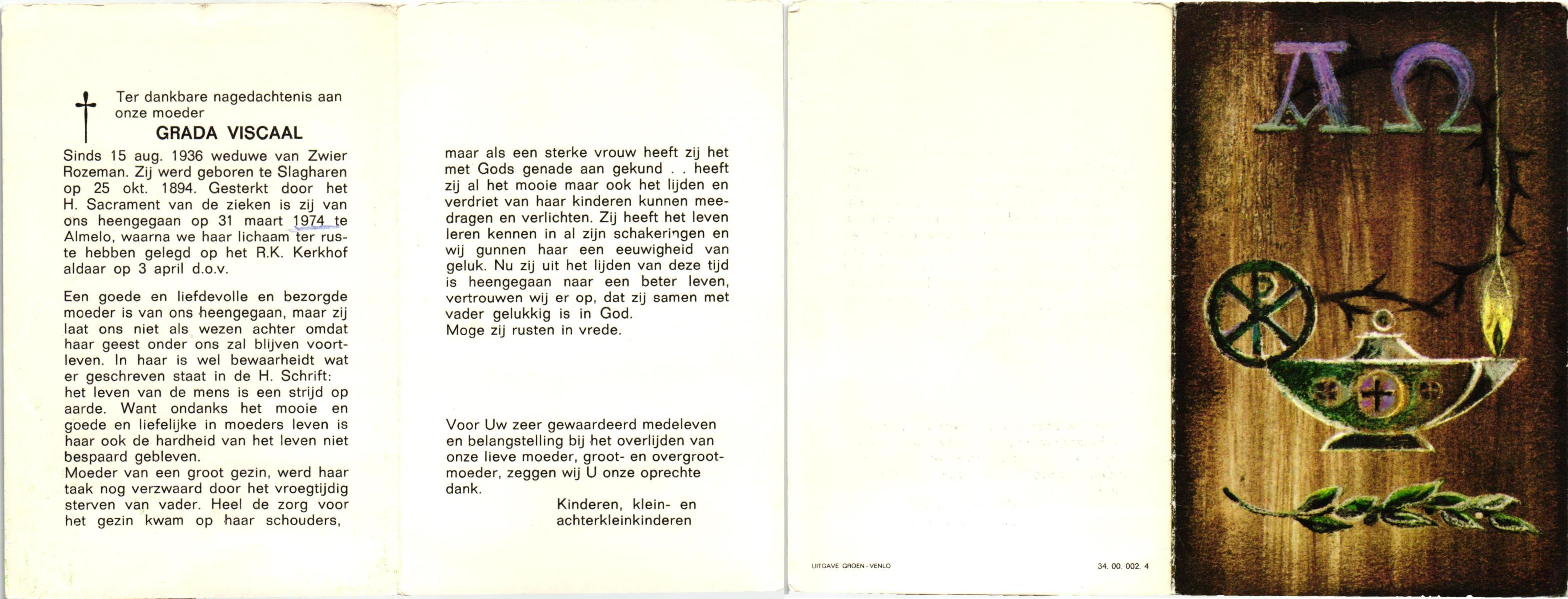 VISCAAL, Grada, geboren op 25-10-1894 te Slagharen, overleden op 31-3-1974 te Almelo op 79-jarige leeftijd, begraven op 3-4-1974 te Almelo, rk.