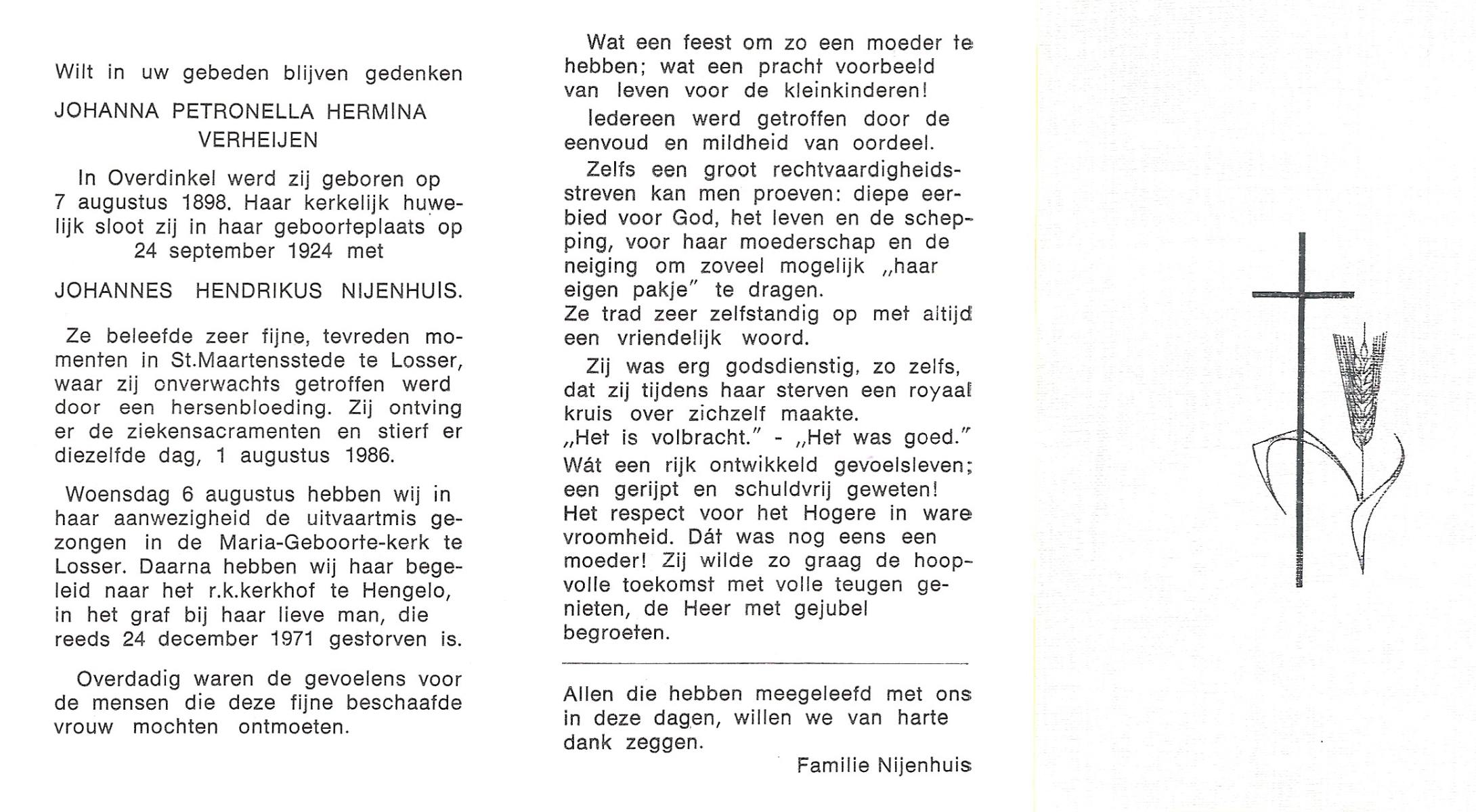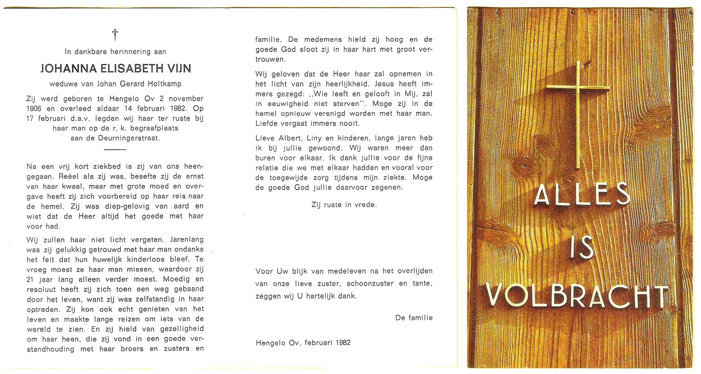 VIJN, Johanna Elisabeth, geboren op 2-11-1906 te Hengelo (O), overleden op 14-2-1982 te Hengelo (Ov.) op 75-jarige leeftijd, begraven op 17-2-1982 te Hengelo (Ov.).