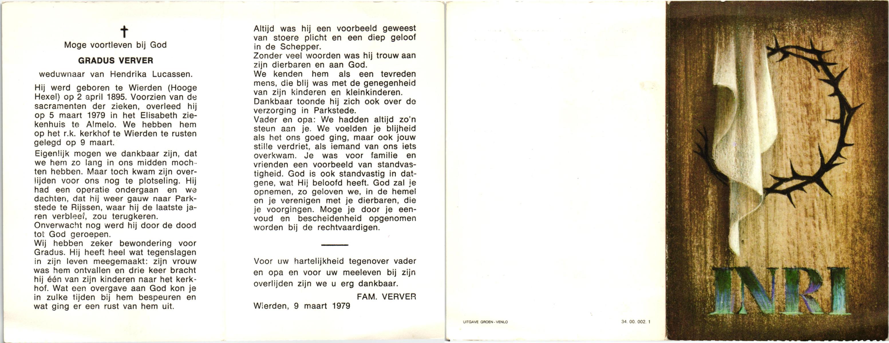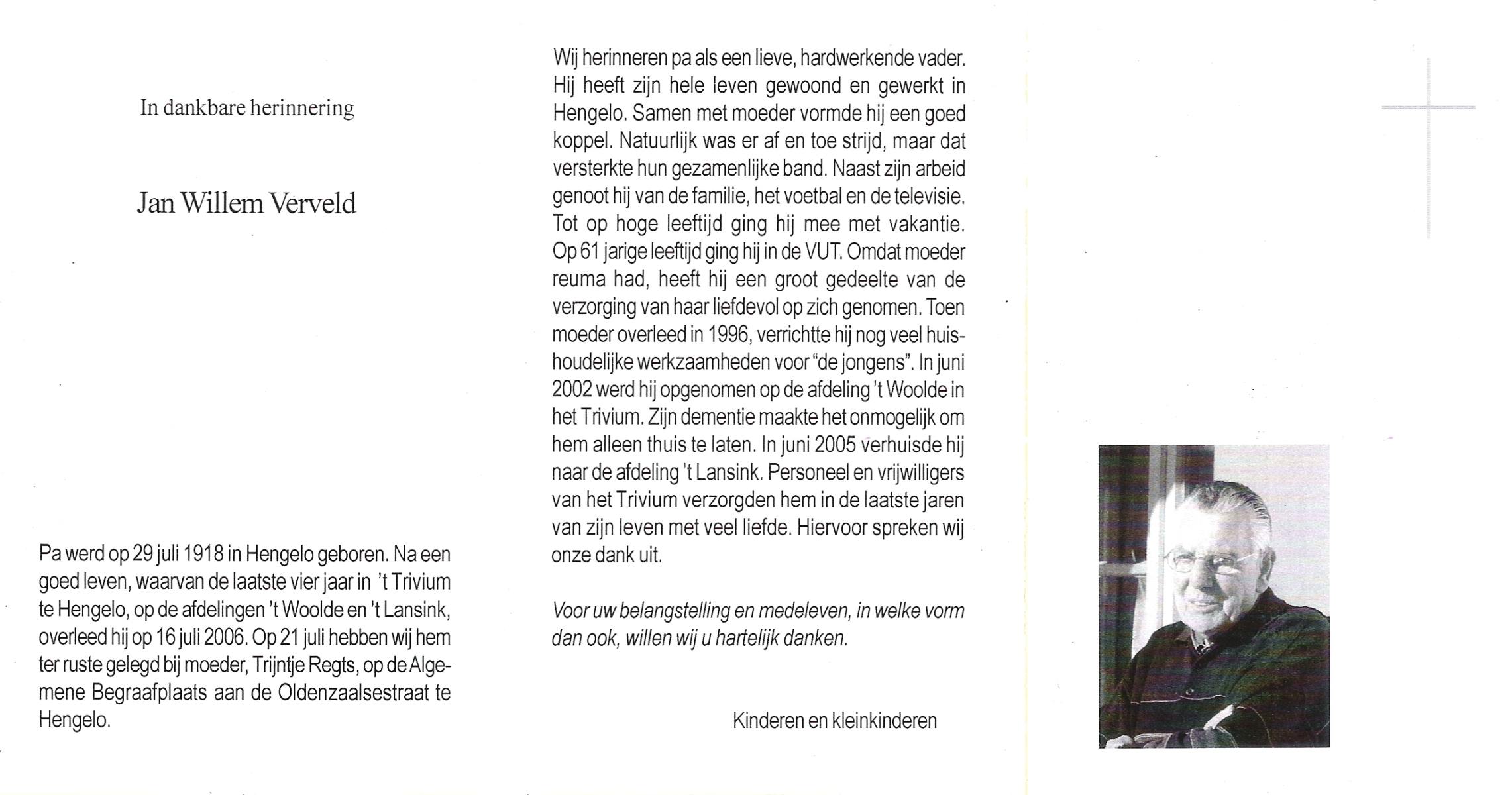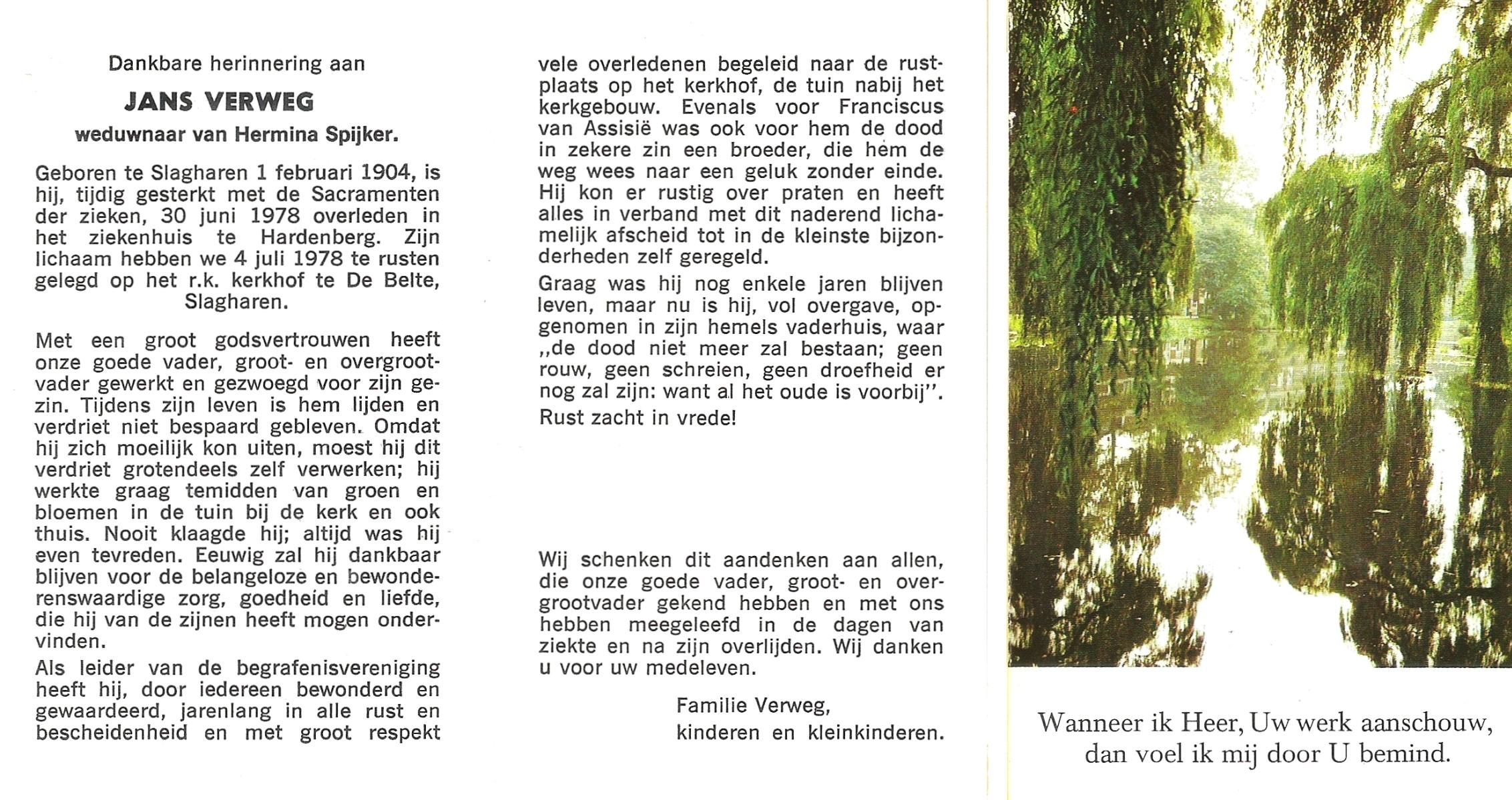 VERWEG, Jans, geboren op 1-2-1904 te Slagharen, overleden op 30-6-1978 te Hardenberg op 74-jarige leeftijd, begraven op 4-7-1978 te Slagharen kerkhof de Belte.