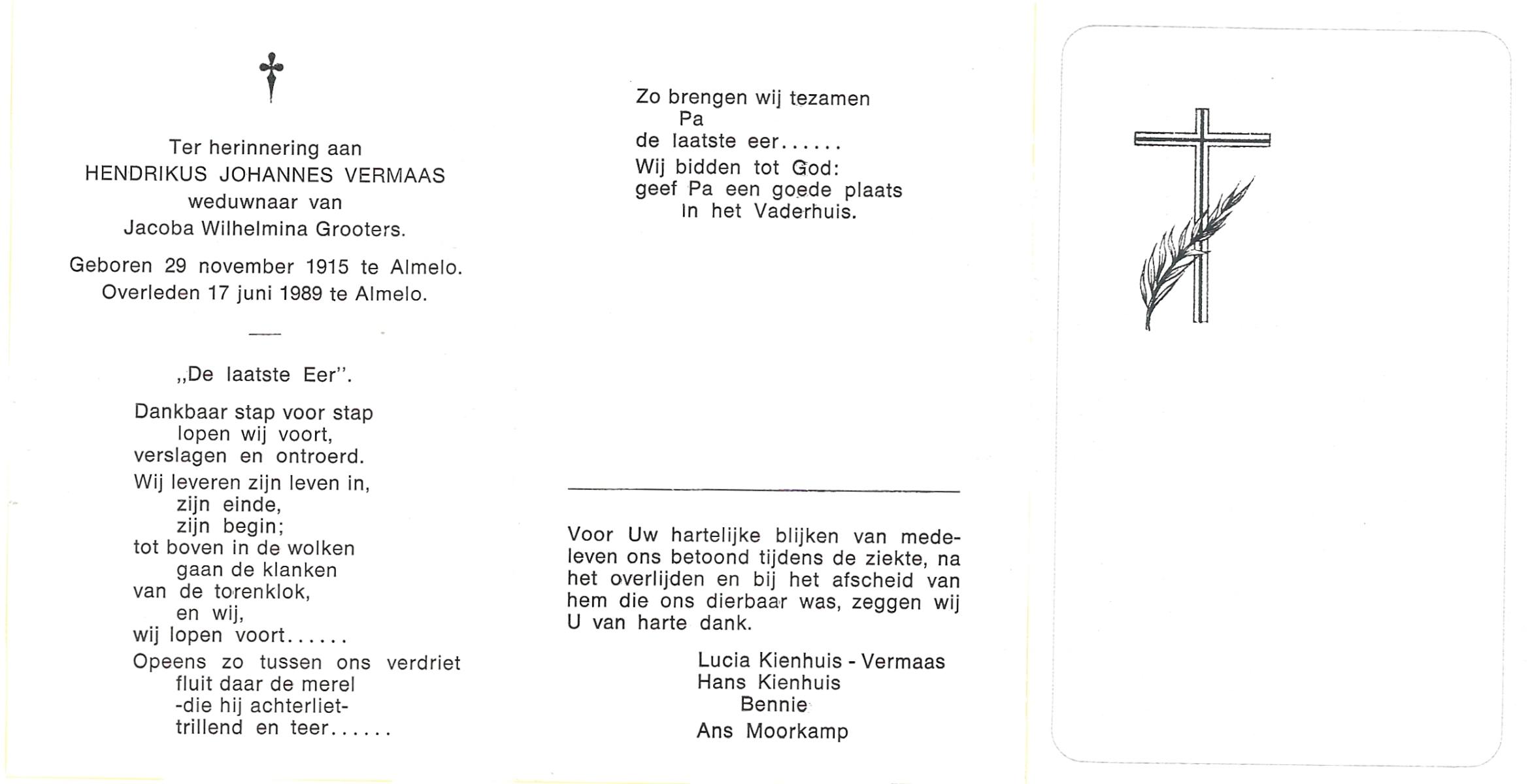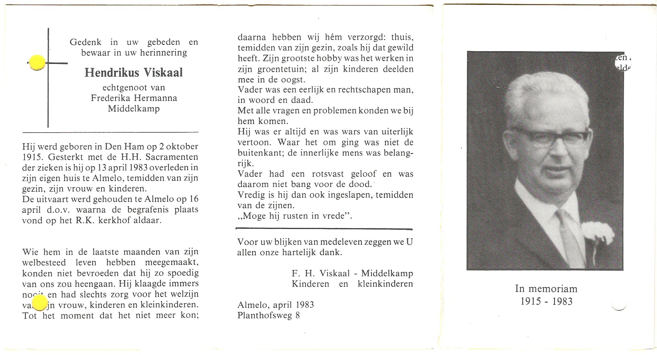 VISKAAL, Hendrikus, geboren op 2-10-1915 te Den Ham, overleden op 13-4-1983 te Almelo op 67-jarige leeftijd, begraven op 16-4-1983 te Almelo.