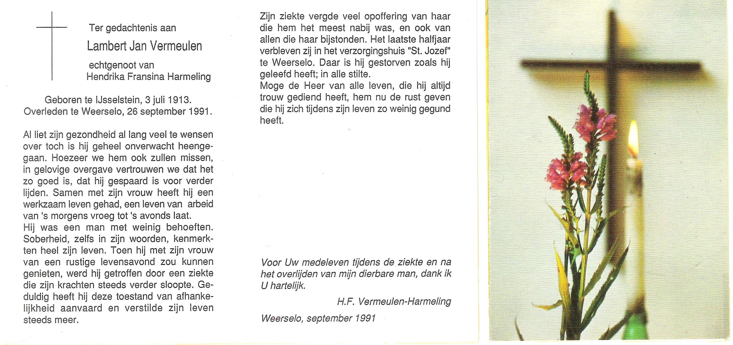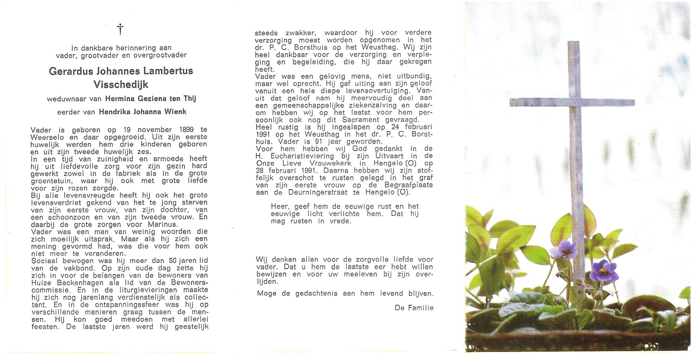 VISSCHEDIJK, Gerardus Johannes Lambertus, geboren op 19-11-1899 te Weerselo, overleden op 24-2-1991 te Hengelo (Ov.) op 91-jarige leeftijd, begraven op 28-2-1991 te Hengelo (Ov.).
