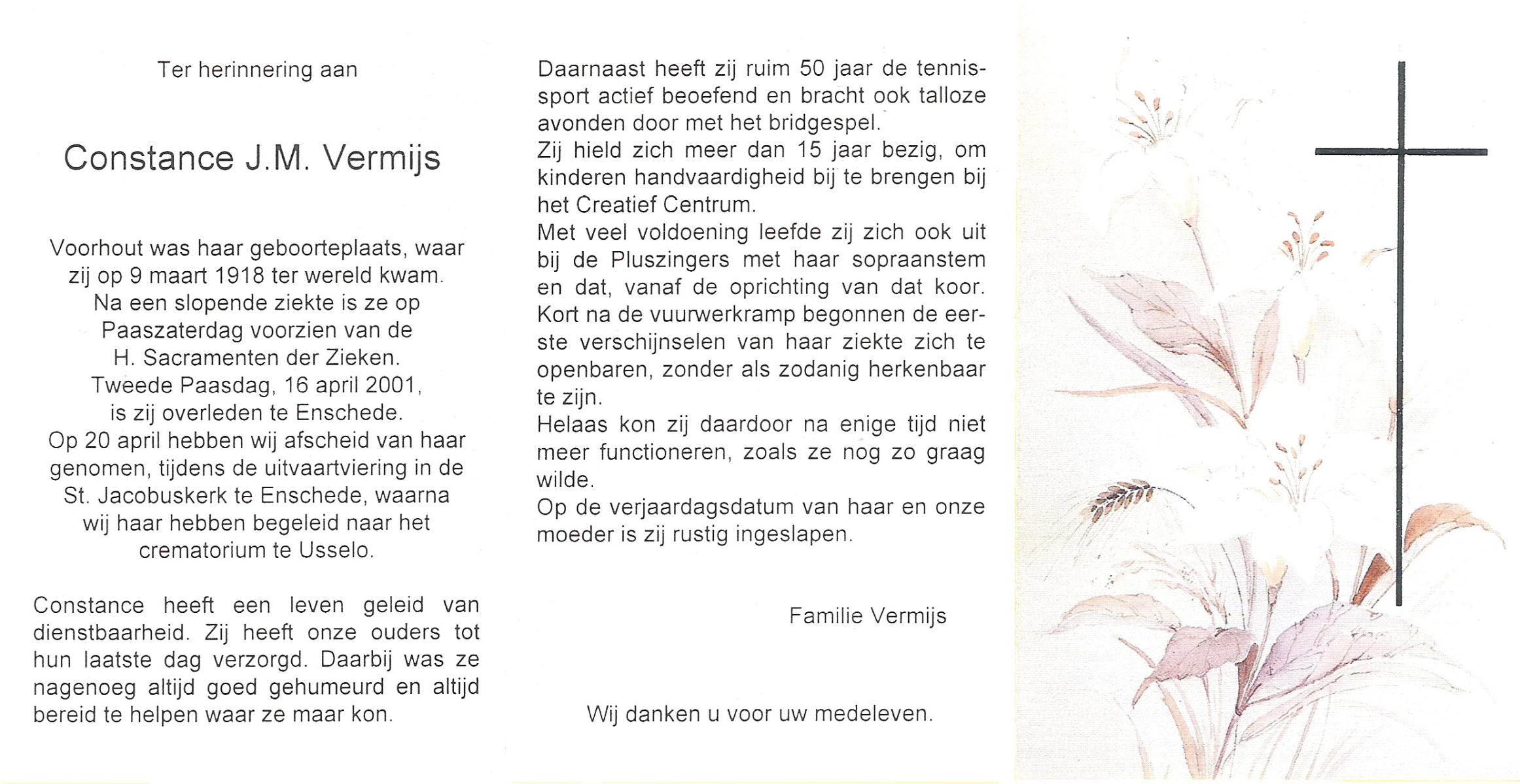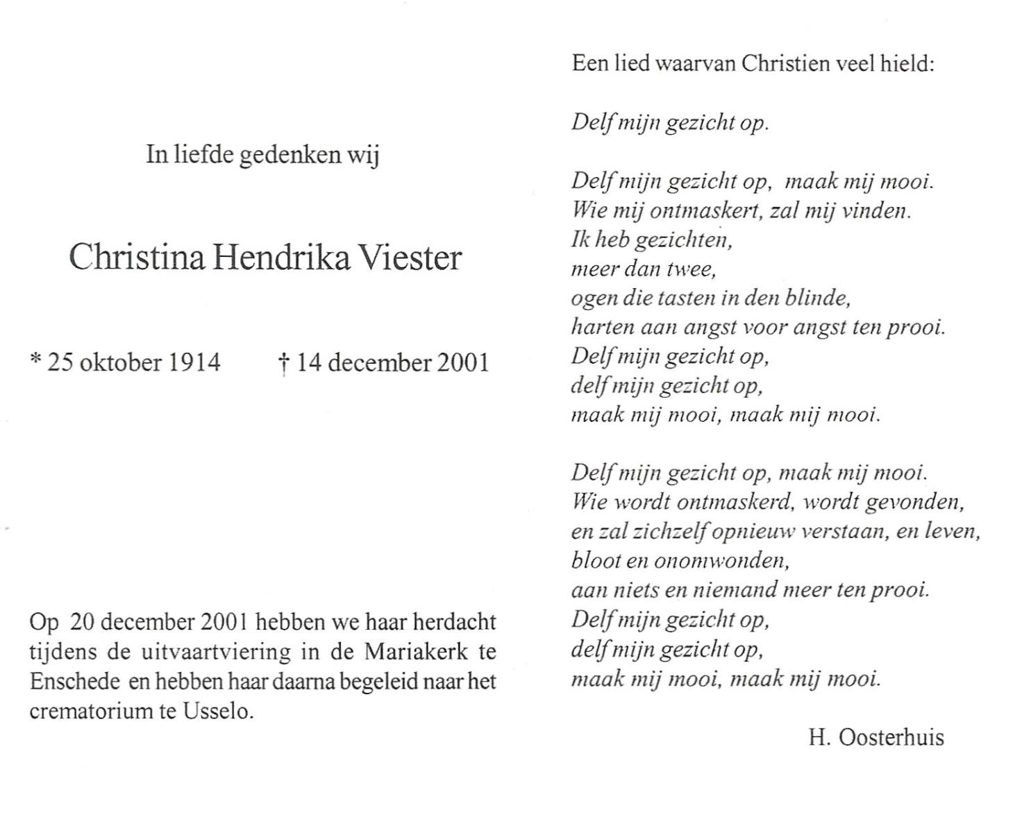 VIESTER, Christina Hendrika, geboren op 25-10-1914, overleden op 14-12-2001 op 87-jarige leeftijd, gecremeerd op 20-12-2001 te Usselo.