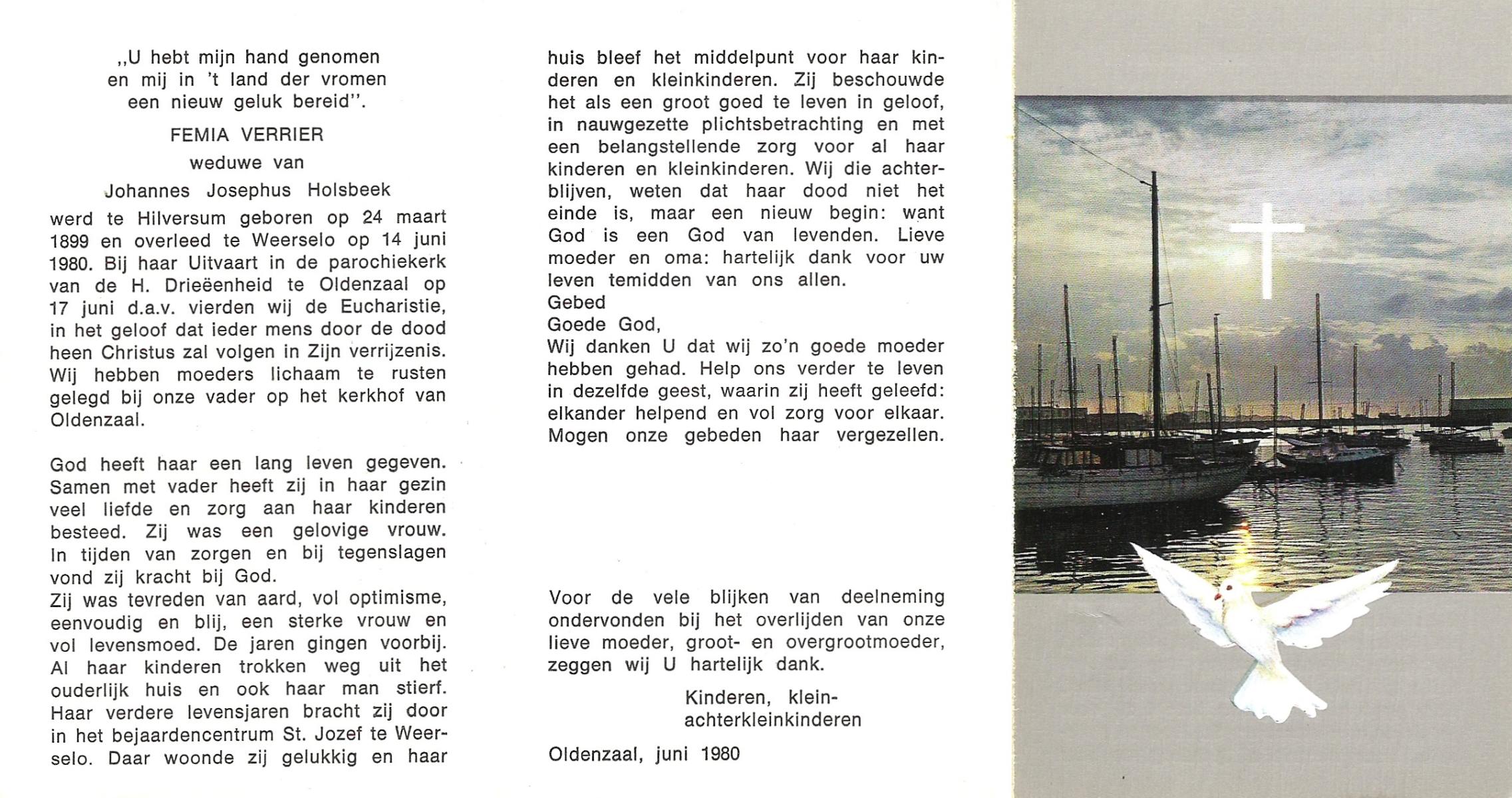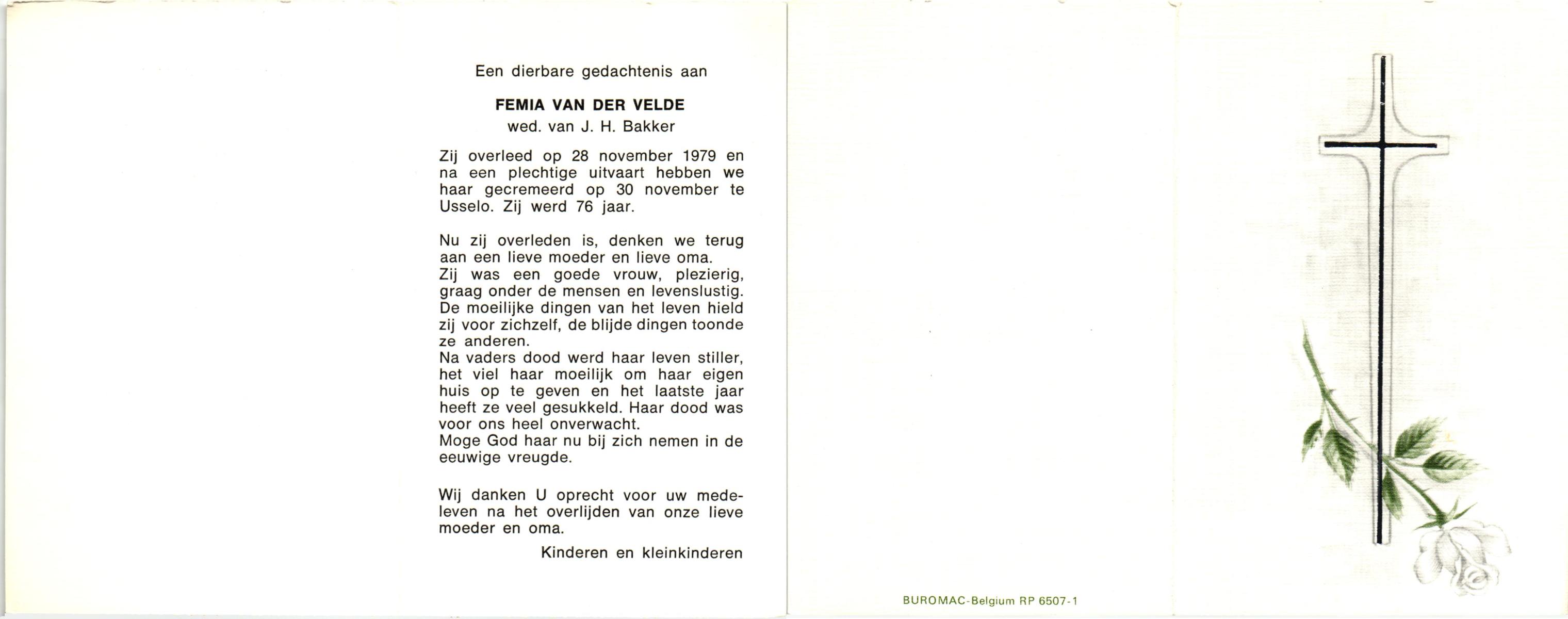 VELDE, van de, Femia, overleden op 28-11-1979 op 76-jarige leeftijd, gecremeerd op 30-11-1979 te Usselo.