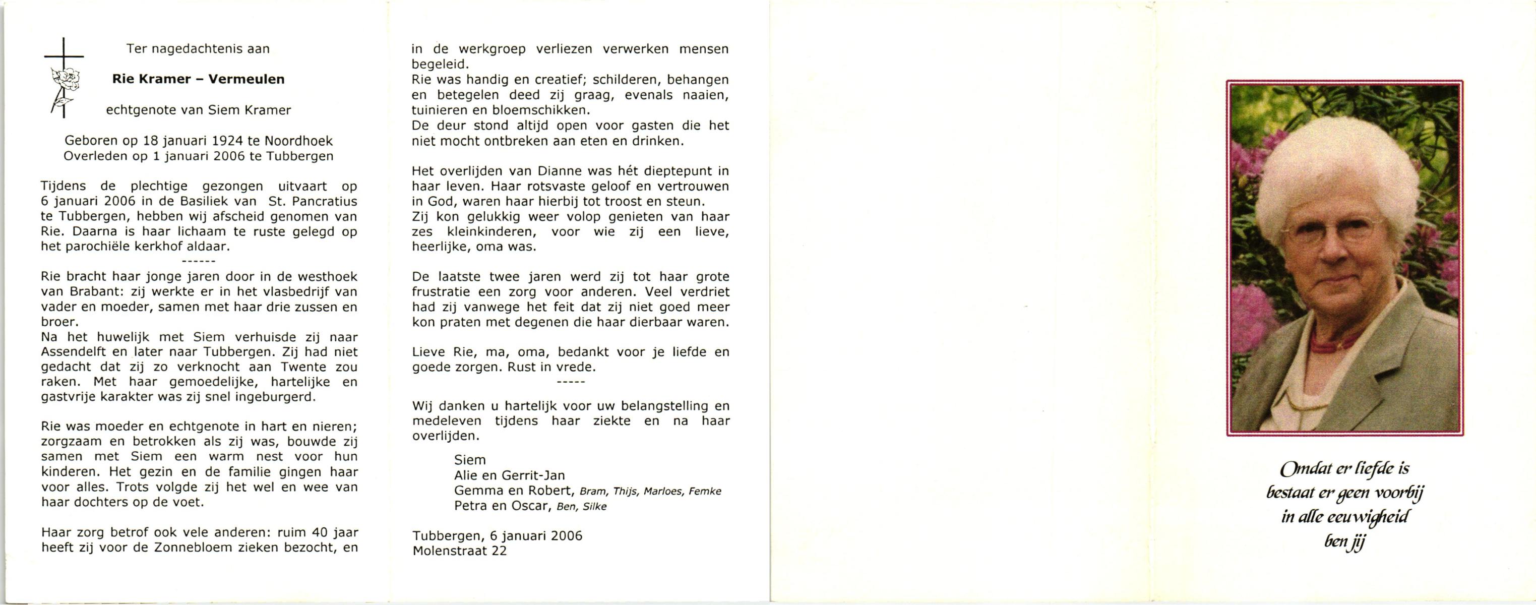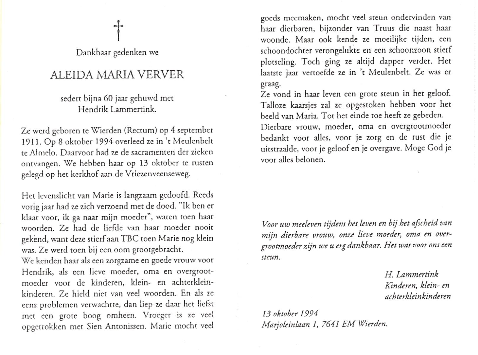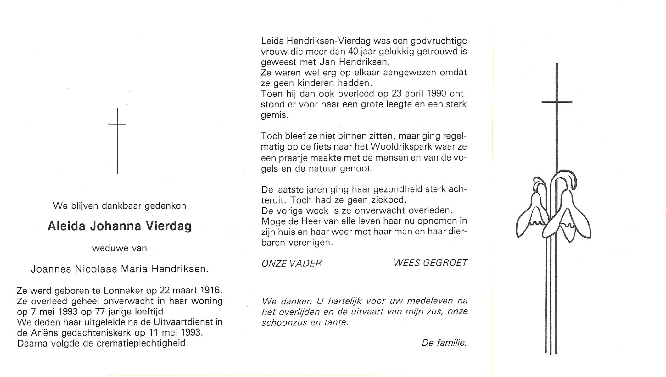 VIERDAG, Aleida Johanna, geboren op 22-3-1916 te Lonneker, overleden op 7-5-1993 op 77-jarige leeftijd, gecremeerd op 11-5-1993 te Usselo.