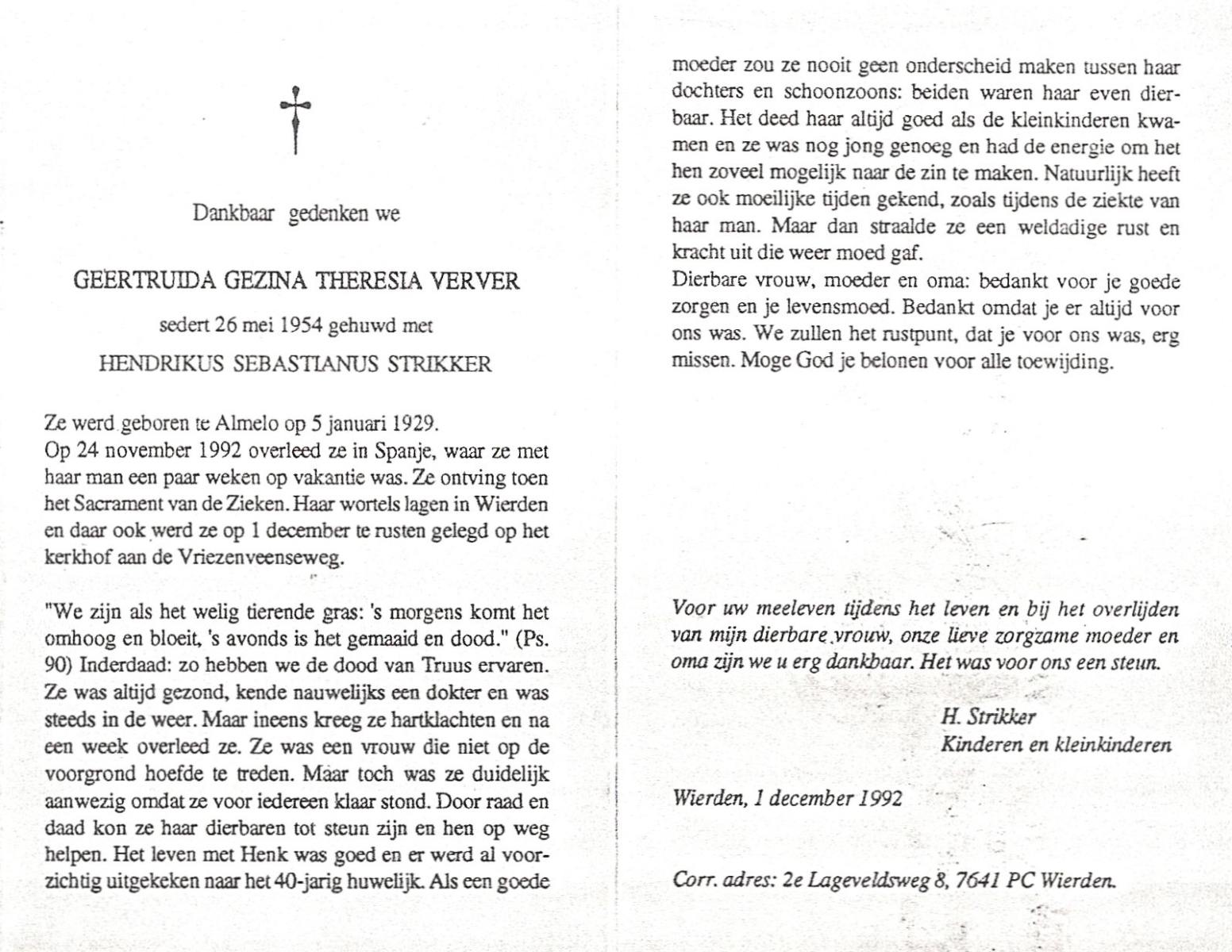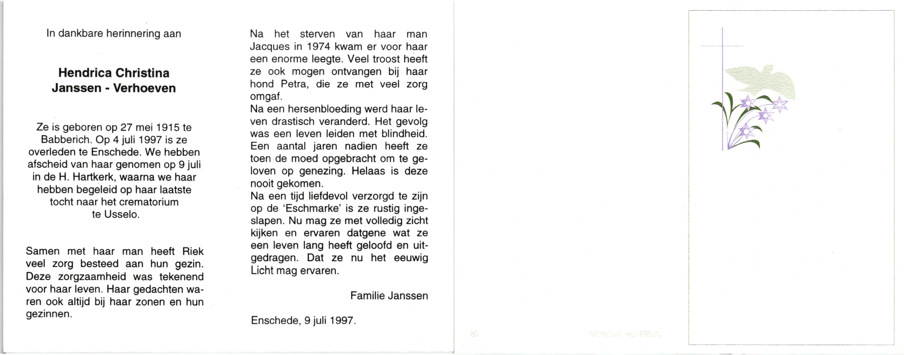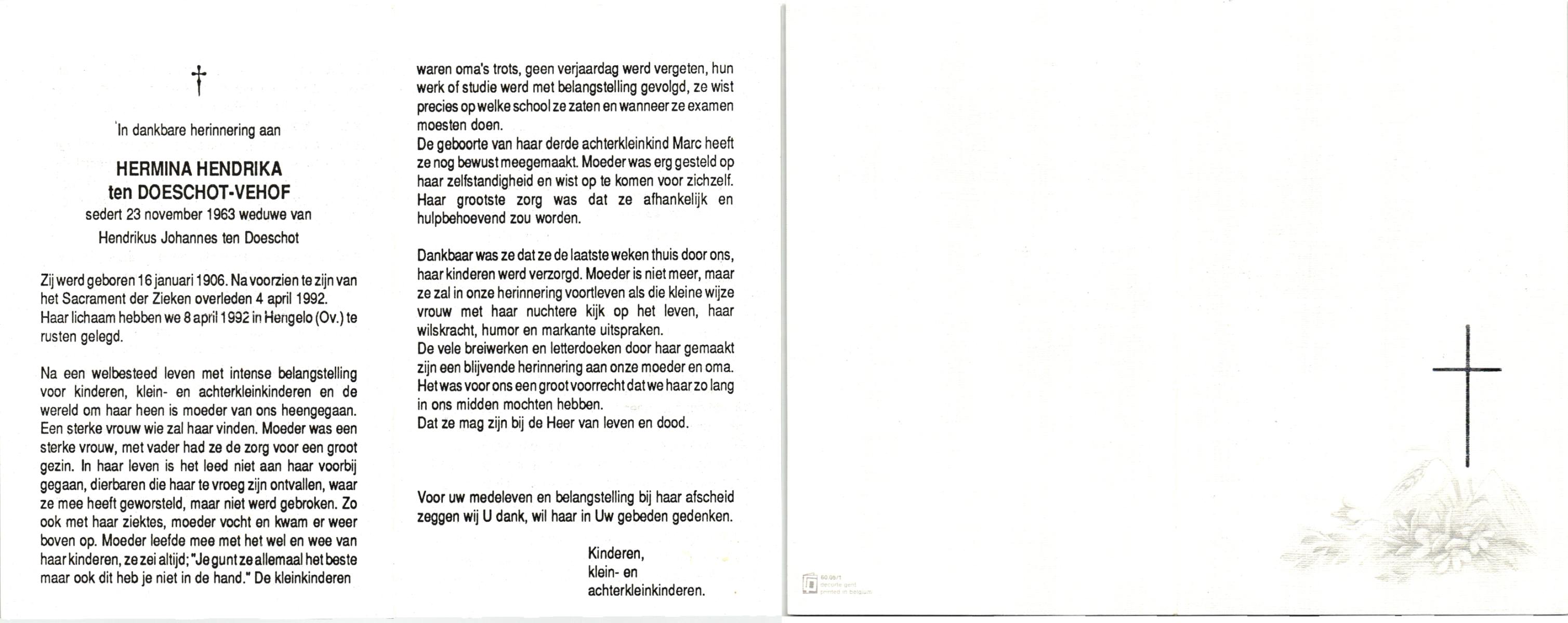 VEHOF, , Hendrika Hermina, geboren op 16-1-1906, overleden op 4-4-1992 op 86-jarige leeftijd, begraven op 8-4-1992 te Hengelo.