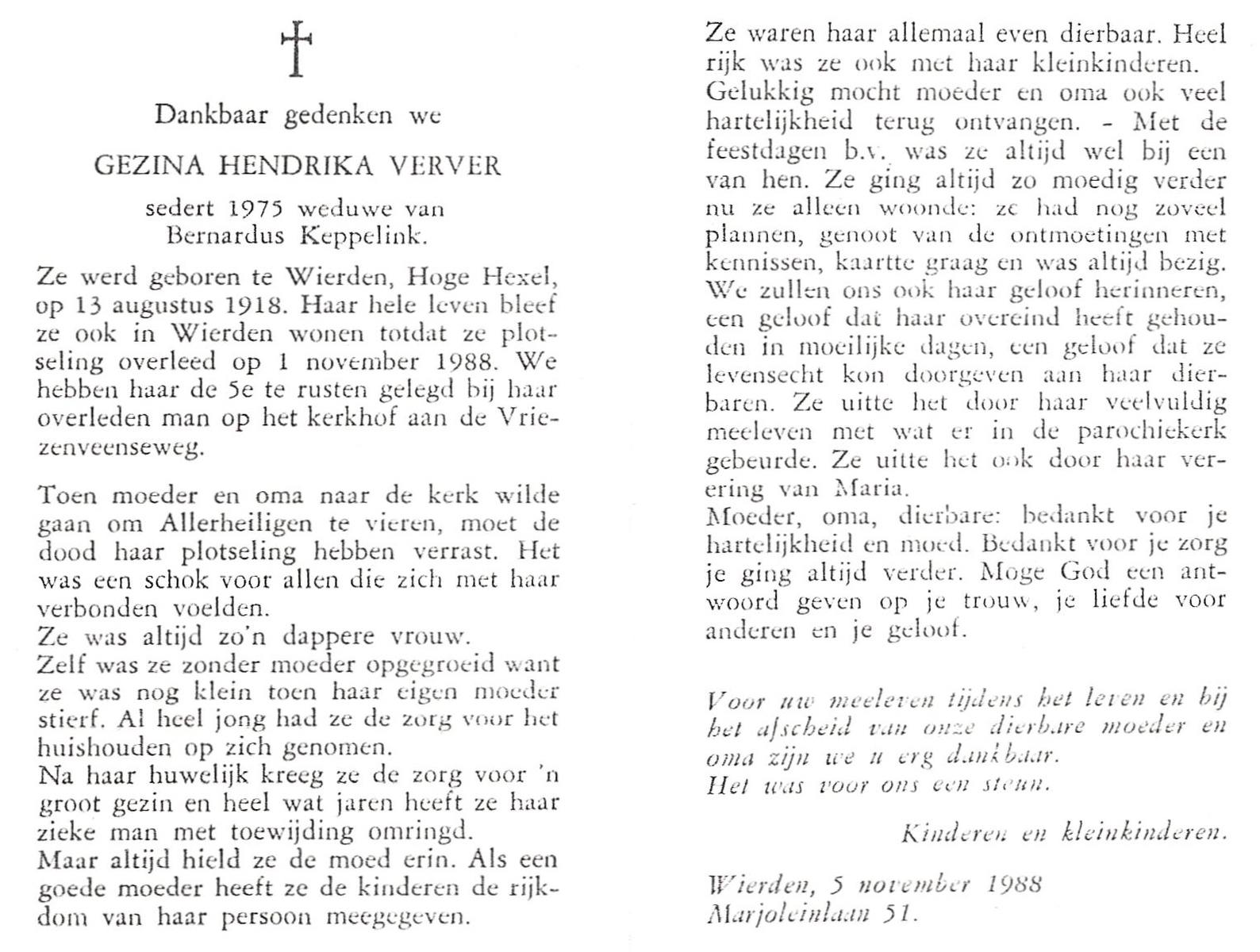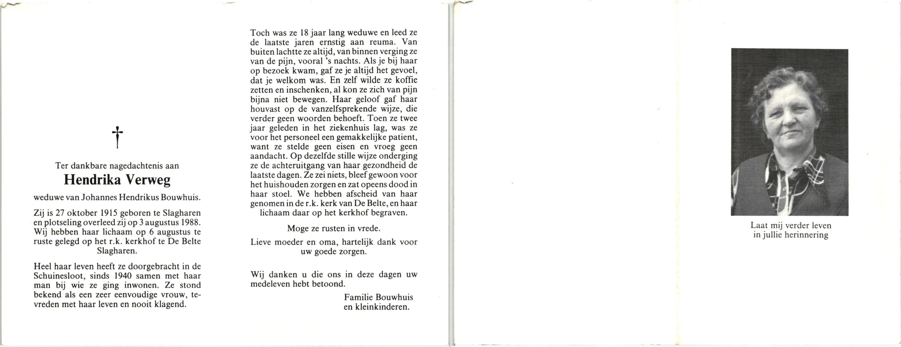 VERWEG, , Hendrika, geboren op 27-10-1915 te Slagharen, overleden op 3-8-1988 op 72-jarige leeftijd, begraven op 6-8-1988 te Slagharen.