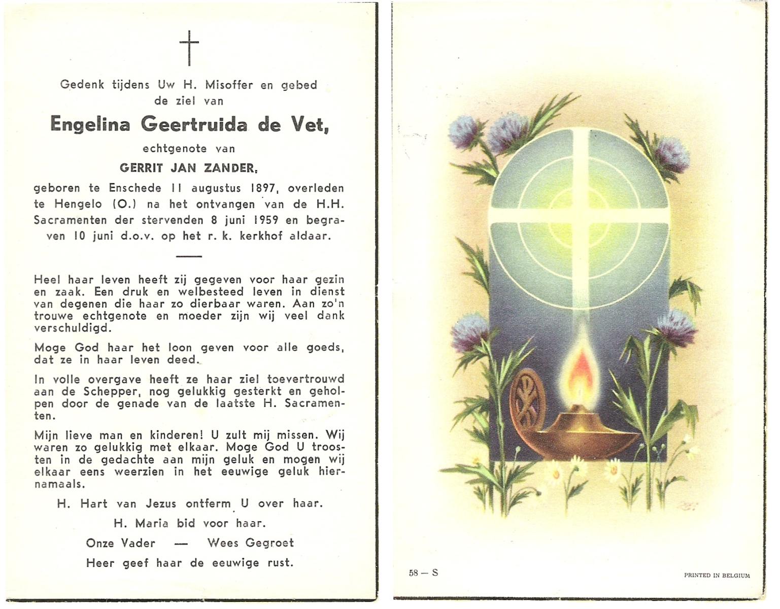 VET, de, Engelina Geertruida, geboren op 11-08-1897 te Enschede, overleden op 8-6-1959 te Hengelo (Ov.) op 61-jarige leeftijd, begraven op 10-6-1959 te Hengelo (Ov.).