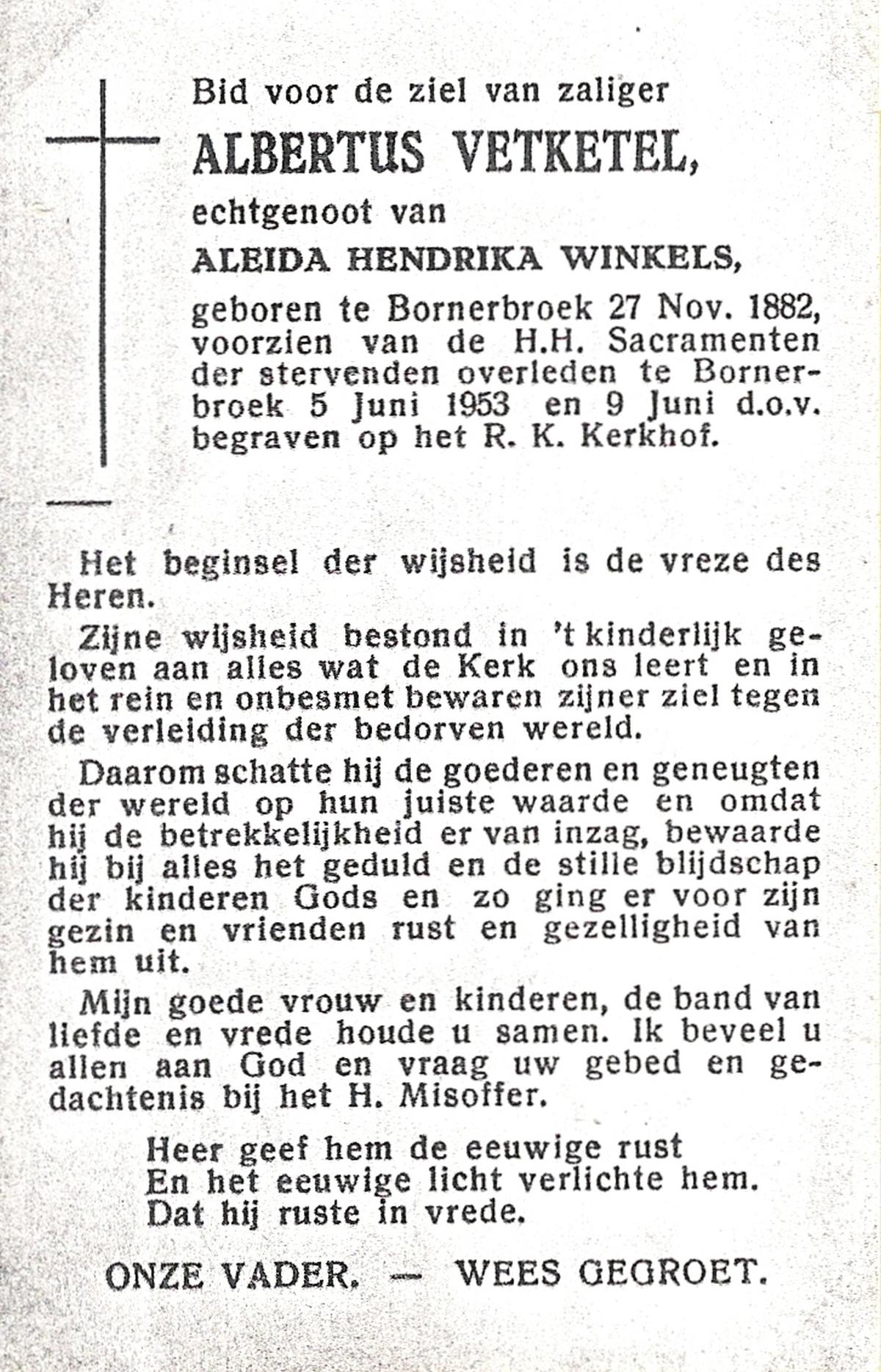 VETKETEL, Albertus, geboren op 27-11-1882 te Bornerbroek, overleden op 5-6-1953 te Bornerbroek op 70-jarige leeftijd, begraven op 9-6-1953 te Bornerbroek.