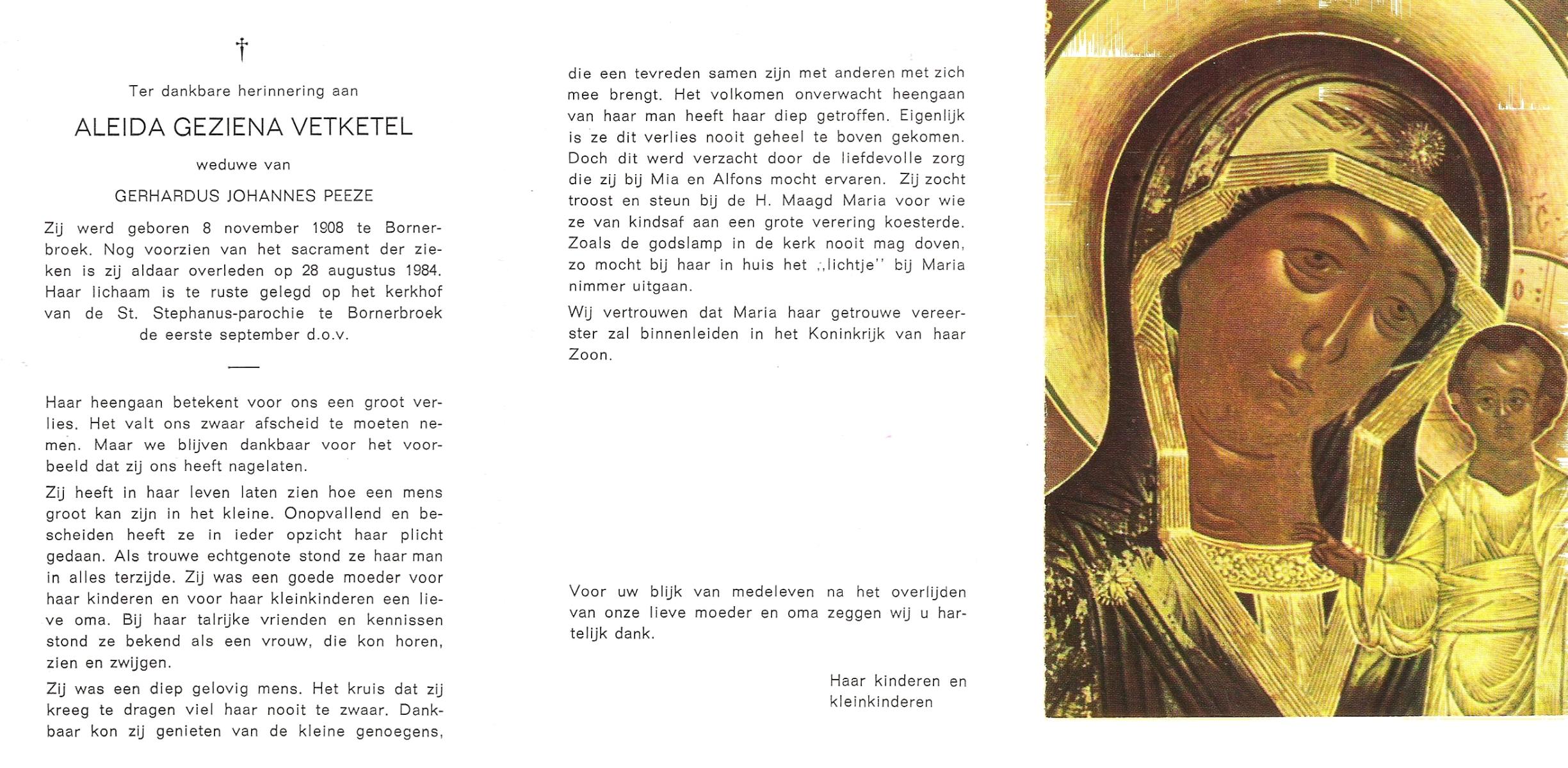 VETKETEL, Aleida Geziena, geboren op 8-11-1908 te Bornerbroek, overleden op 28-8-1984 te Bornerbroek op 75-jarige leeftijd, begraven op 1-9-1984 te Bornerbroek.