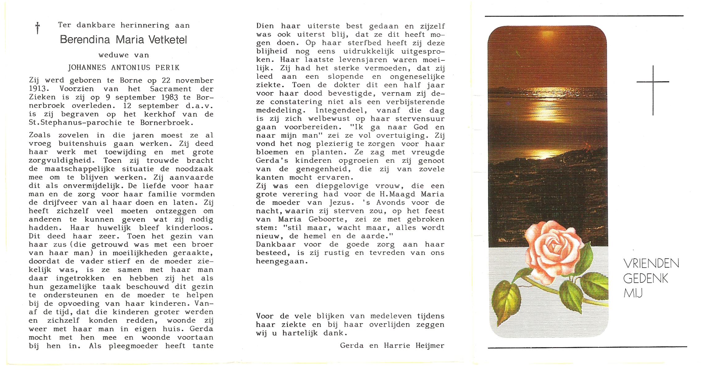 VETKETEL, Berendina Maria, geboren op 22-11-1913 te Borne, overleden op 9-9-1983 te Bornerbroek op 69-jarige leeftijd, begraven op 12-9-1983 te Bornerbroek.