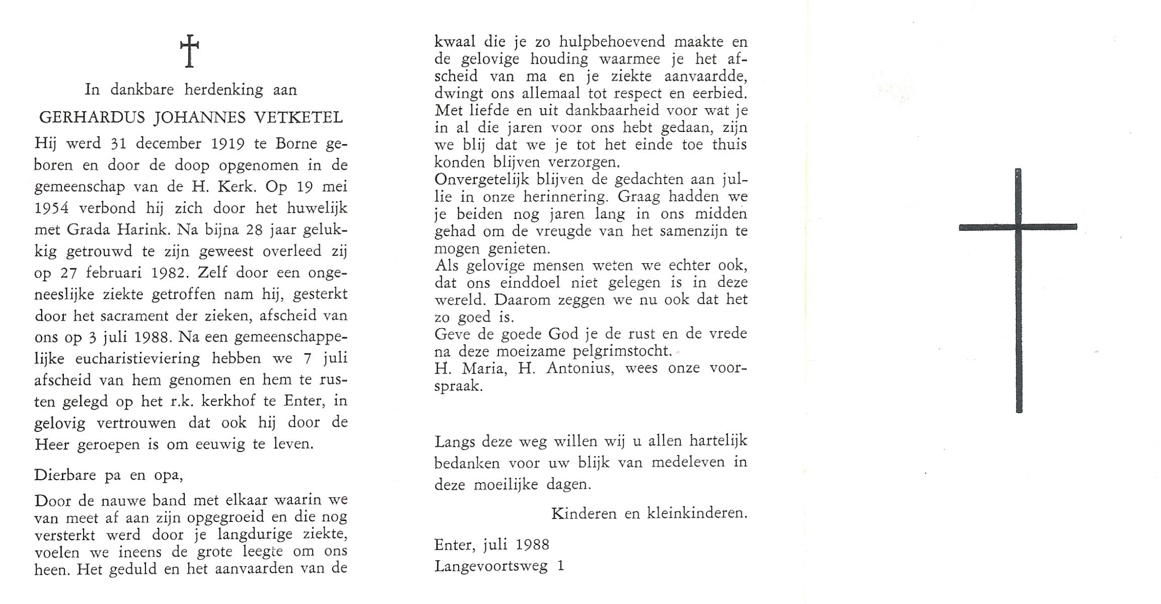 VETKETEL, Gerhardus Johannes, geboren op 31-12-1919 te Borne, overleden op 3-7-1988 op 68-jarige leeftijd, begraven op 7-7-1988 te Wierden, Enter.