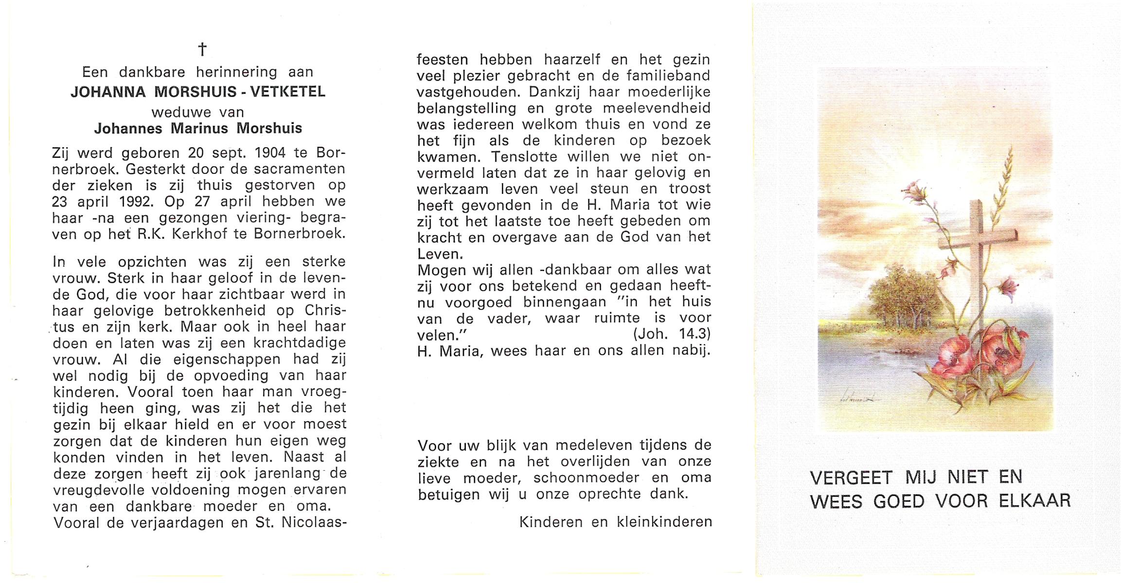 VETKETEL, Johanna, geboren op 20-9-1904 te Bornerbroek, overleden op 23-4-1992 op 87-jarige leeftijd, begraven op 27-4-1992 te Bornerbroek.
