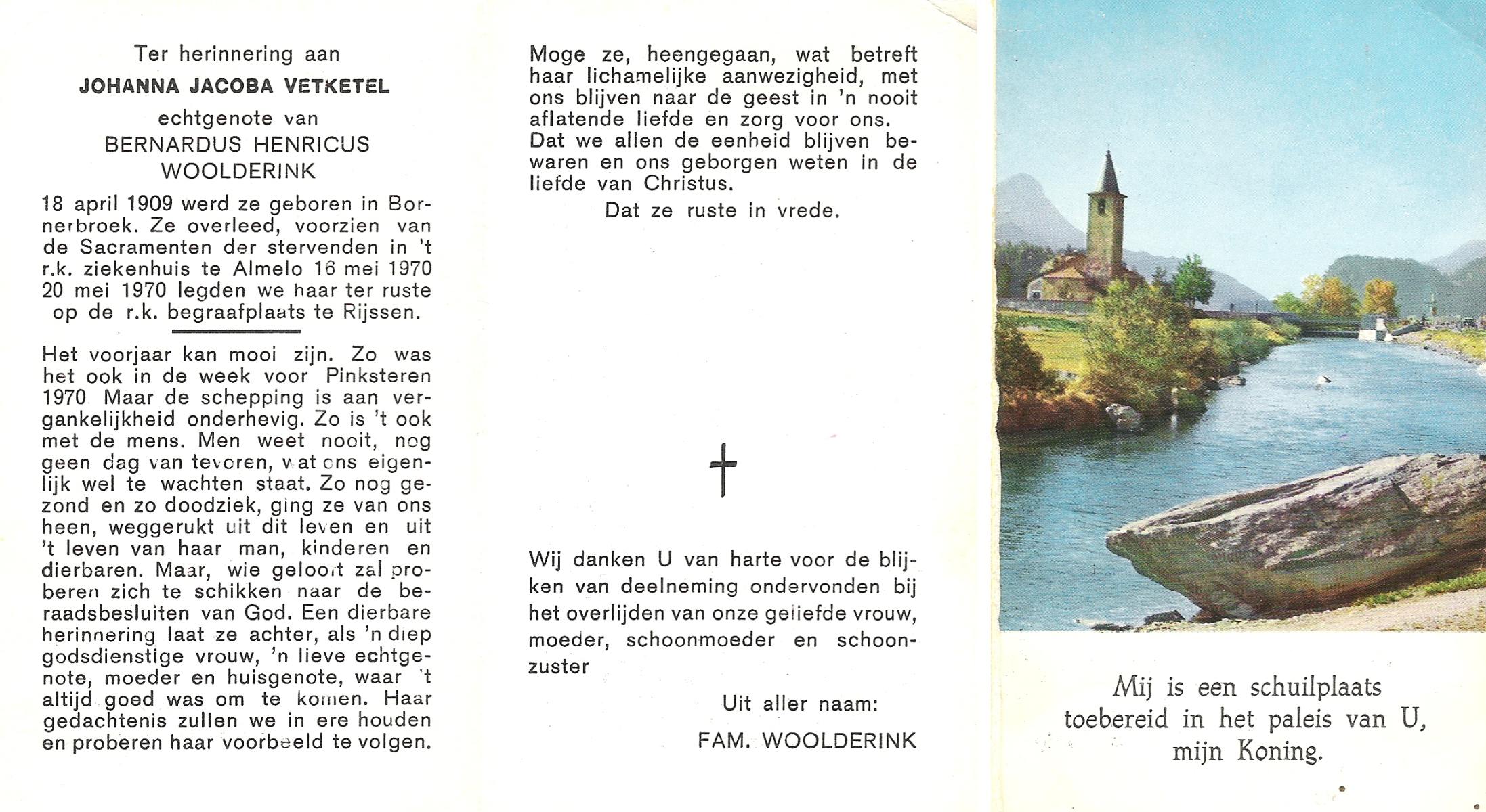VETKETEL, Johanna Jacoba, geboren op 18-4-1909 te Bornerbroek, overleden op 16-5-1970 te Almelo op 61-jarige leeftijd, begraven op 20-5-1970 te Rijssen.