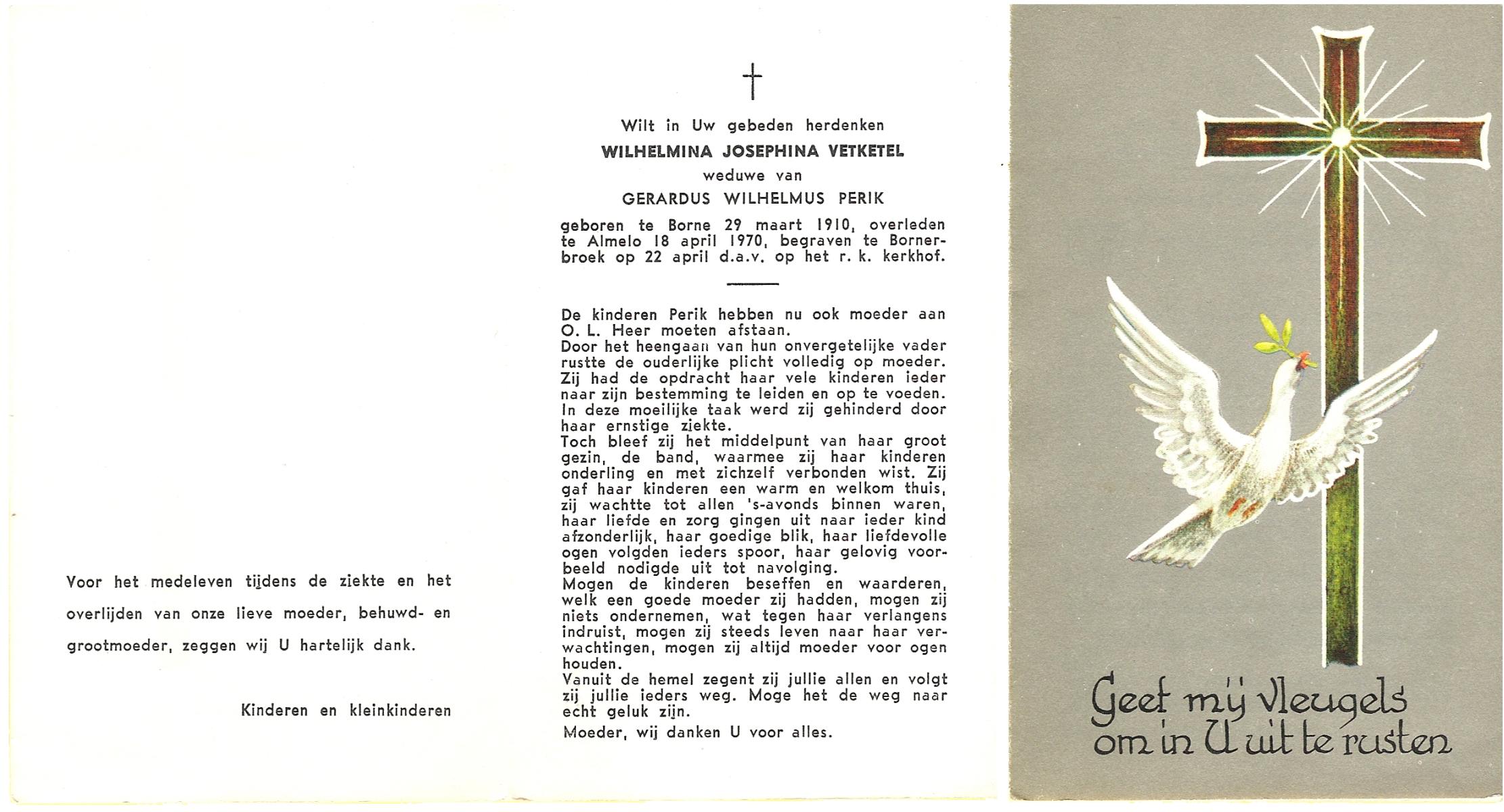 VETKETEL, Wilhelmina Josephina, geboren op 29-3-1910 te Borne, overleden op 18-4-1970 te Almelo op 60-jarige leeftijd, begraven op 22-4-1970 te Bornerbroek.