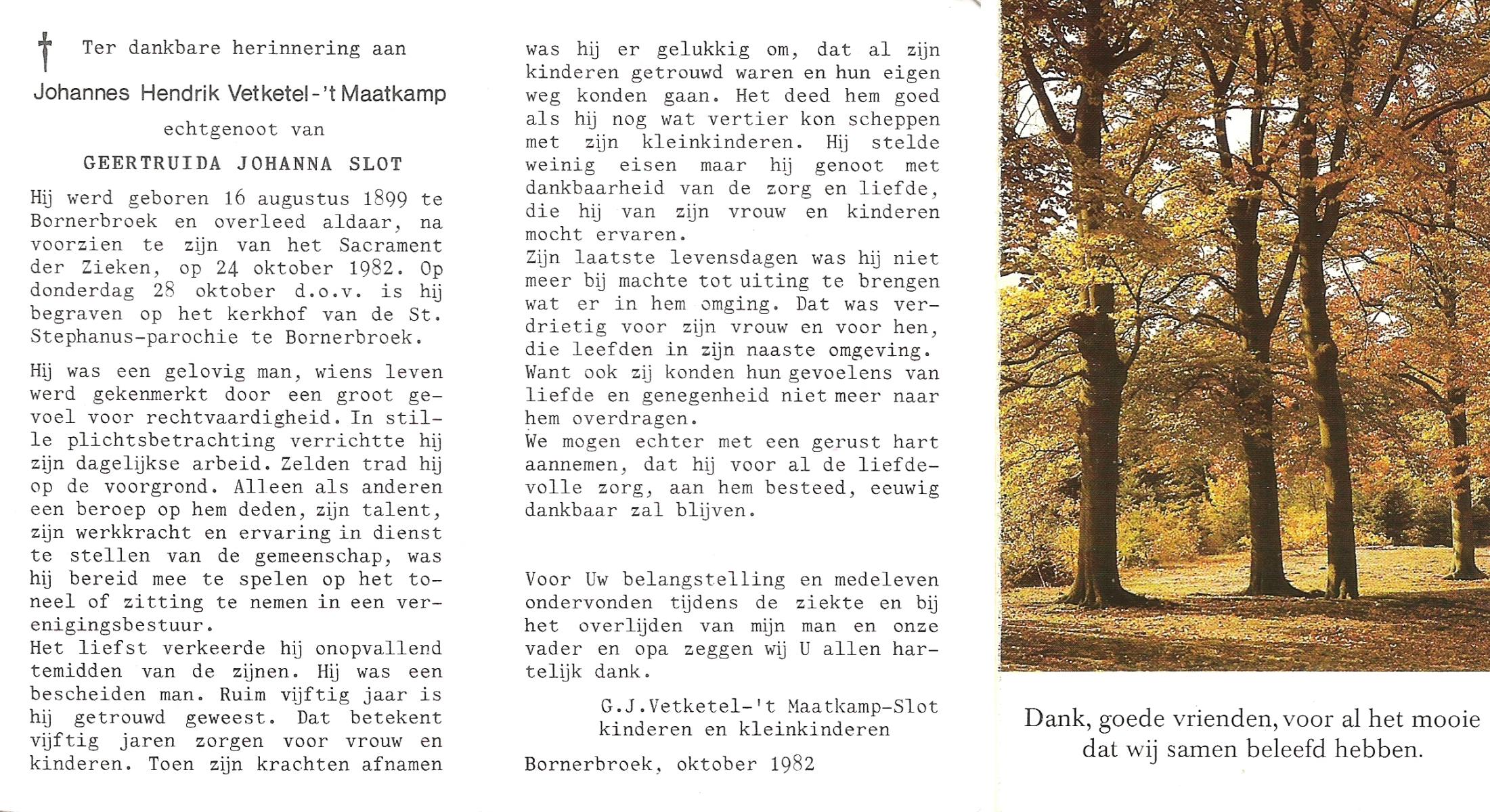 VETKETEL-'t MAATKAMP, Johannes Hendrik, geboren op 16-08-1899 te Bornerbroek, overleden op 24-10-1982 te Bornerbroek op 83-jarige leeftijd, begraven op 28-10-1982 te Bornerbroek.