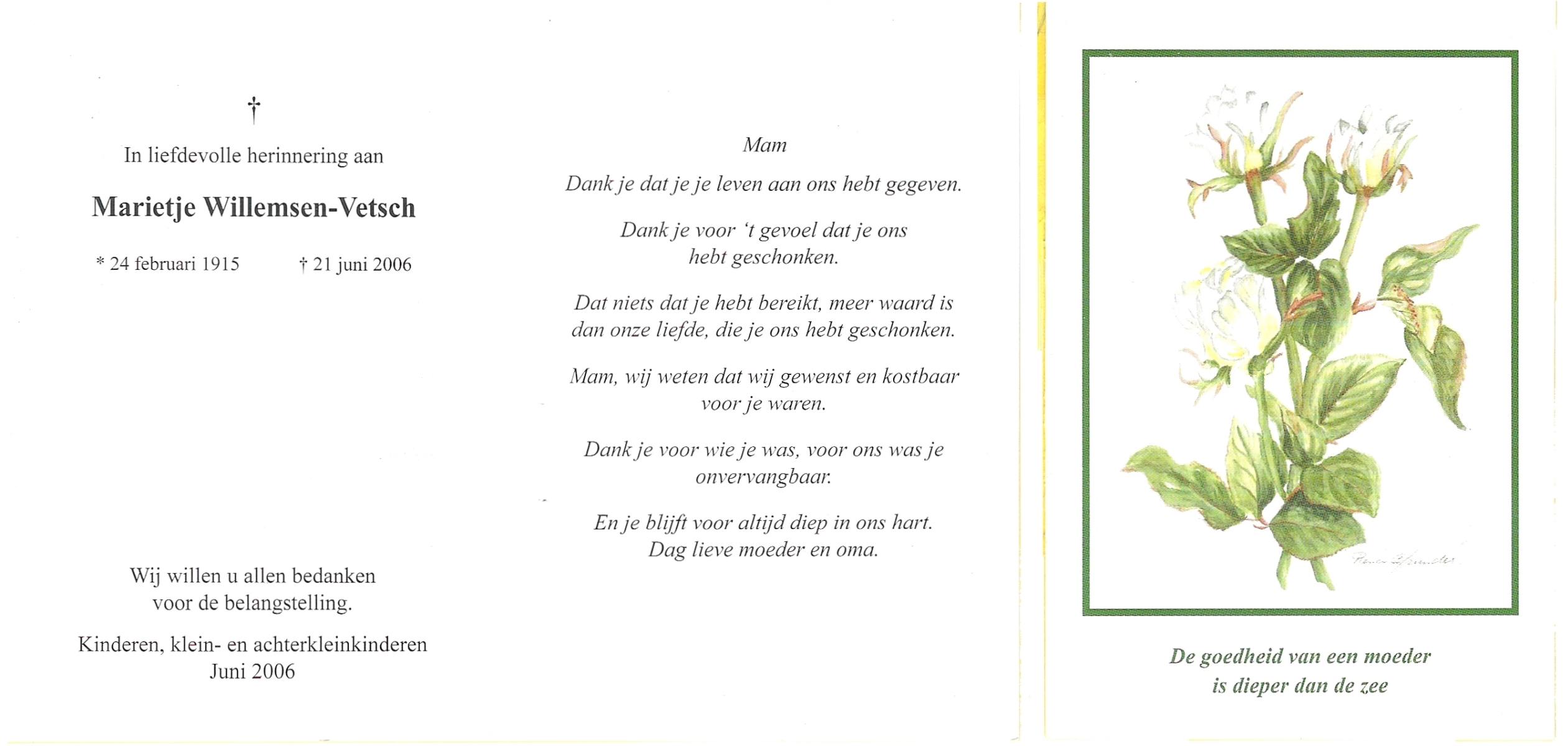VETSCH, Marietje, geboren op 24-2-1915, overleden op 21-6-2006 op 91-jarige leeftijd.