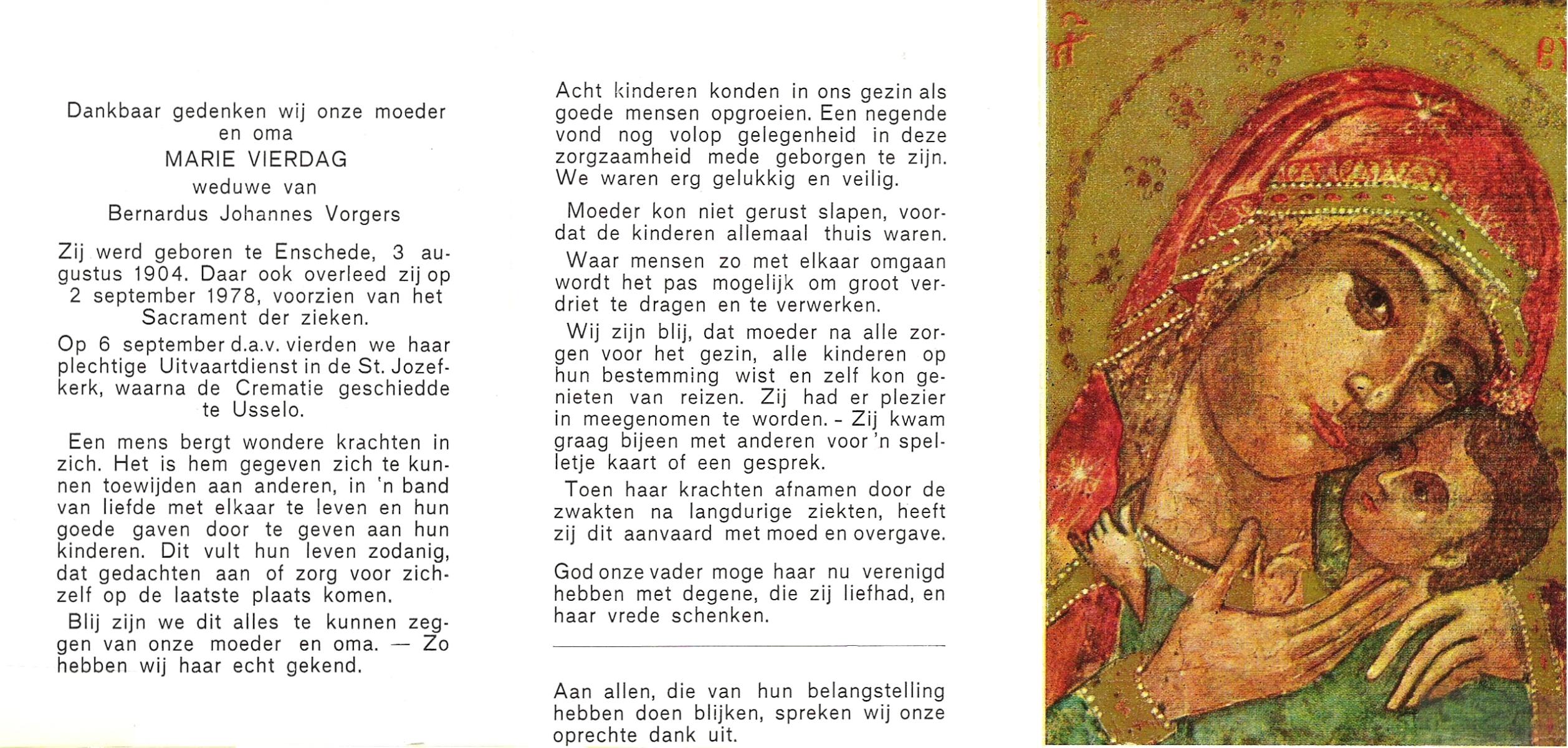 VIERDAG, Marie, geboren op 3-8-1904 te Enschede, overleden op 2-9-1978 te Enschede op 74-jarige leeftijd, gecremeerd op 6-9-1978 te Usselo.