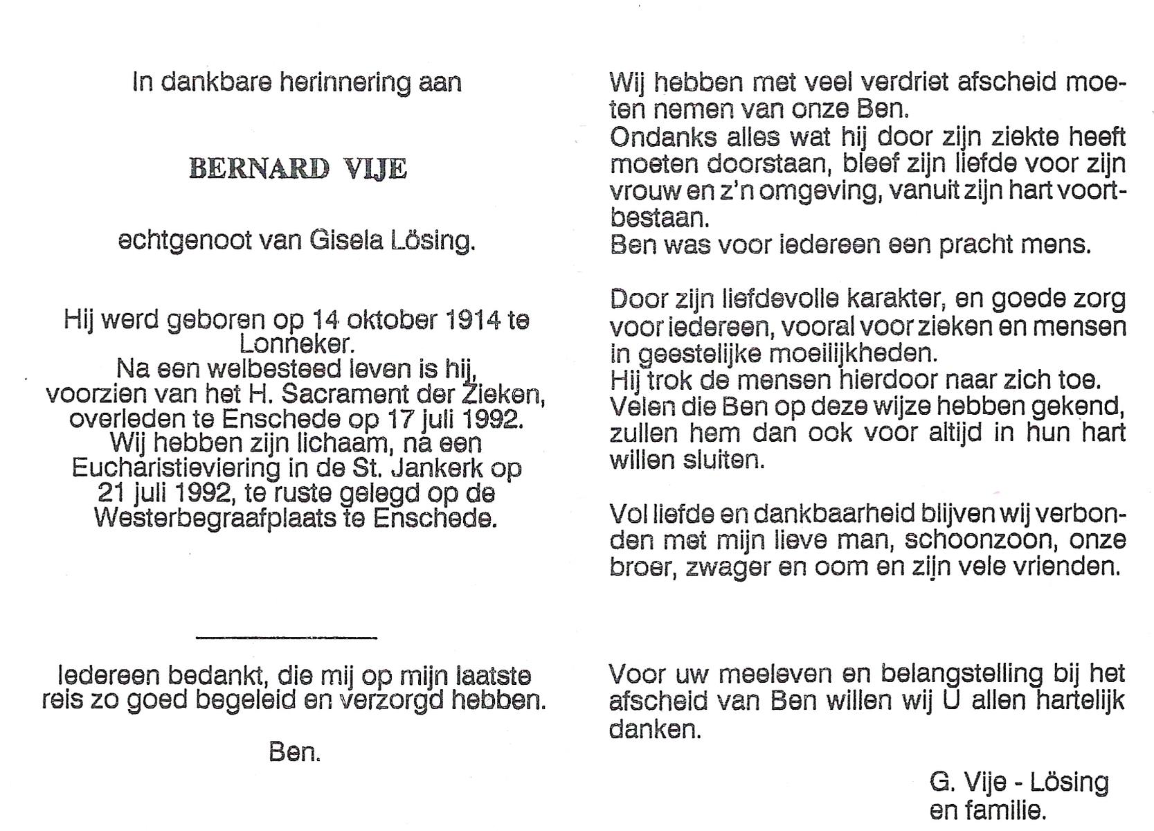 VIJE, Bernard, geboren op 14-10-1914 te Lonneker, overleden op 17-7-1992 te Enschede op 77-jarige leeftijd, begraven op 21-7-1992 te Enschede.