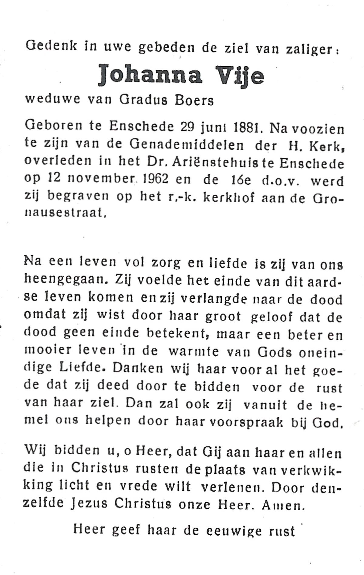 VIJE, Johanna, geboren op 29-06-1881 te Enschede, overleden op 12-11-1962 te Enschede op 80-jarige leeftijd, begraven op 16-11-1962 te Enschede R.K.Kerhof Gronausestraat.