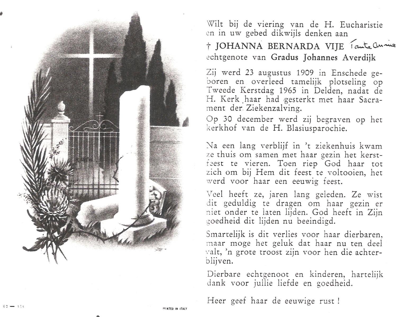VIJE, Johanna Bernarda (Tante Annie), geboren op 23-8-1909 te Enschede, overleden op 26-12-1965 te Delden op 56-jarige leeftijd, begraven op 30-12-1965 te Delden.