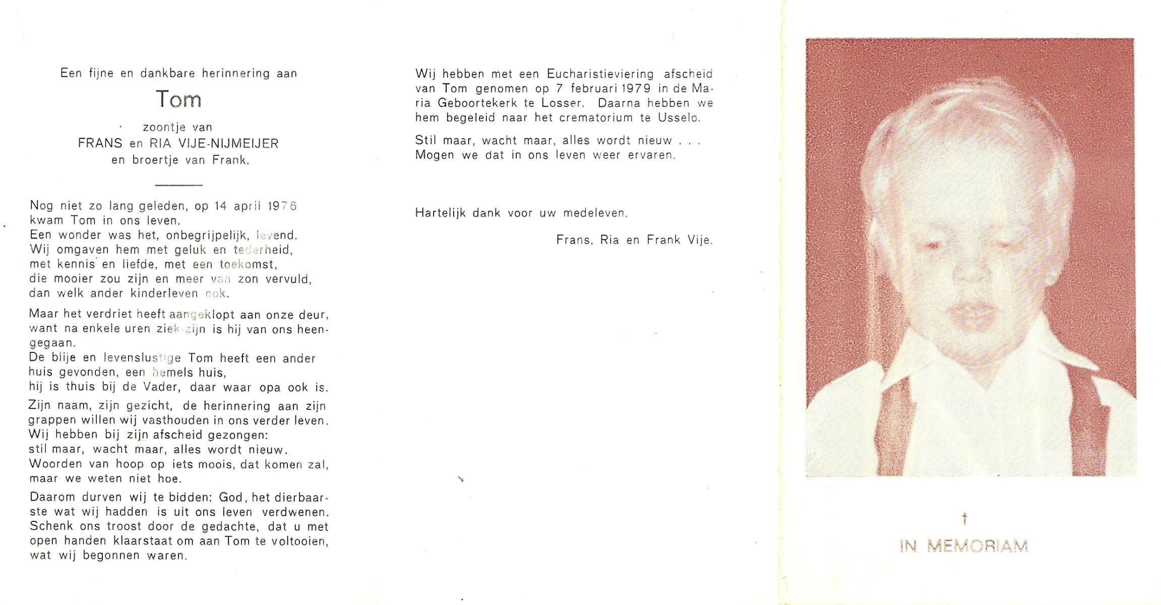 VIJE, Tom, geboren op 14-4-1976, overleden te Losser op 2-jarige leeftijd, gecremeerd op 7-2-1979 te Usselo.