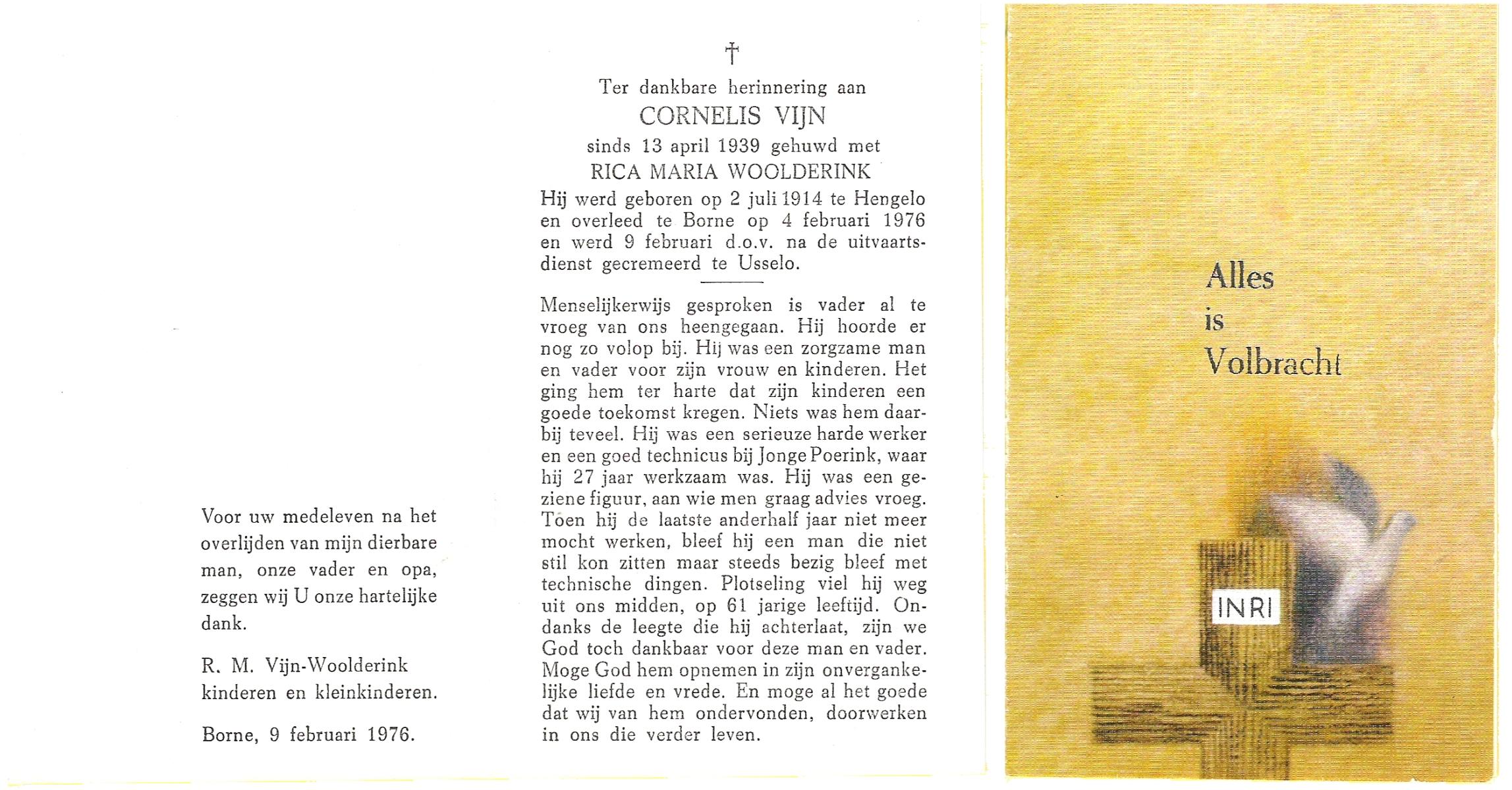 VIJN, Cornelis, geboren op 2-7-1914 te Hengelo (O), overleden op 4-2-1976 te Borne op 61-jarige leeftijd, gecremeerd op 9-2-1976 te Usselo.