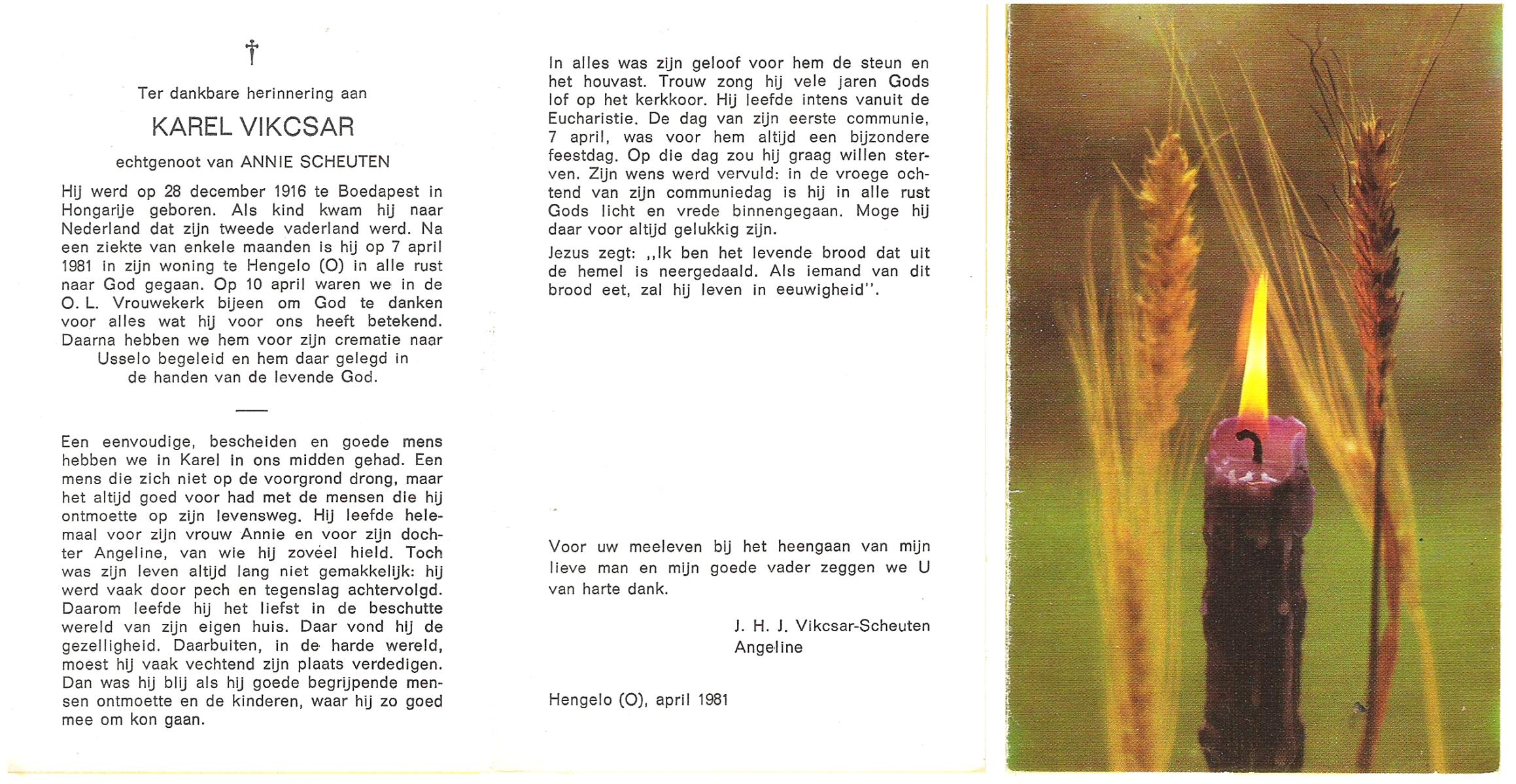 VIKCSAR, Karel, geboren op 28-12-1916 te Boedapest (Hon.), overleden op 7-4-1981 te Hengelo (Ov.) op 64-jarige leeftijd, gecremeerd op 10-4-1981 te Usselo.