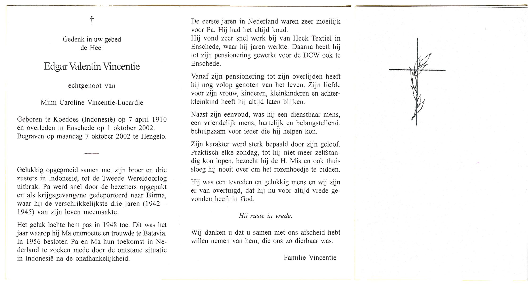 VINCENTIE, Edgar Valentin, geboren op 7-4-1910 te Koedoes (Ind.), overleden op 1-10-2002 te Enschede op 92-jarige leeftijd, begraven op 7-10-2002 te Hengelo (Ov.).