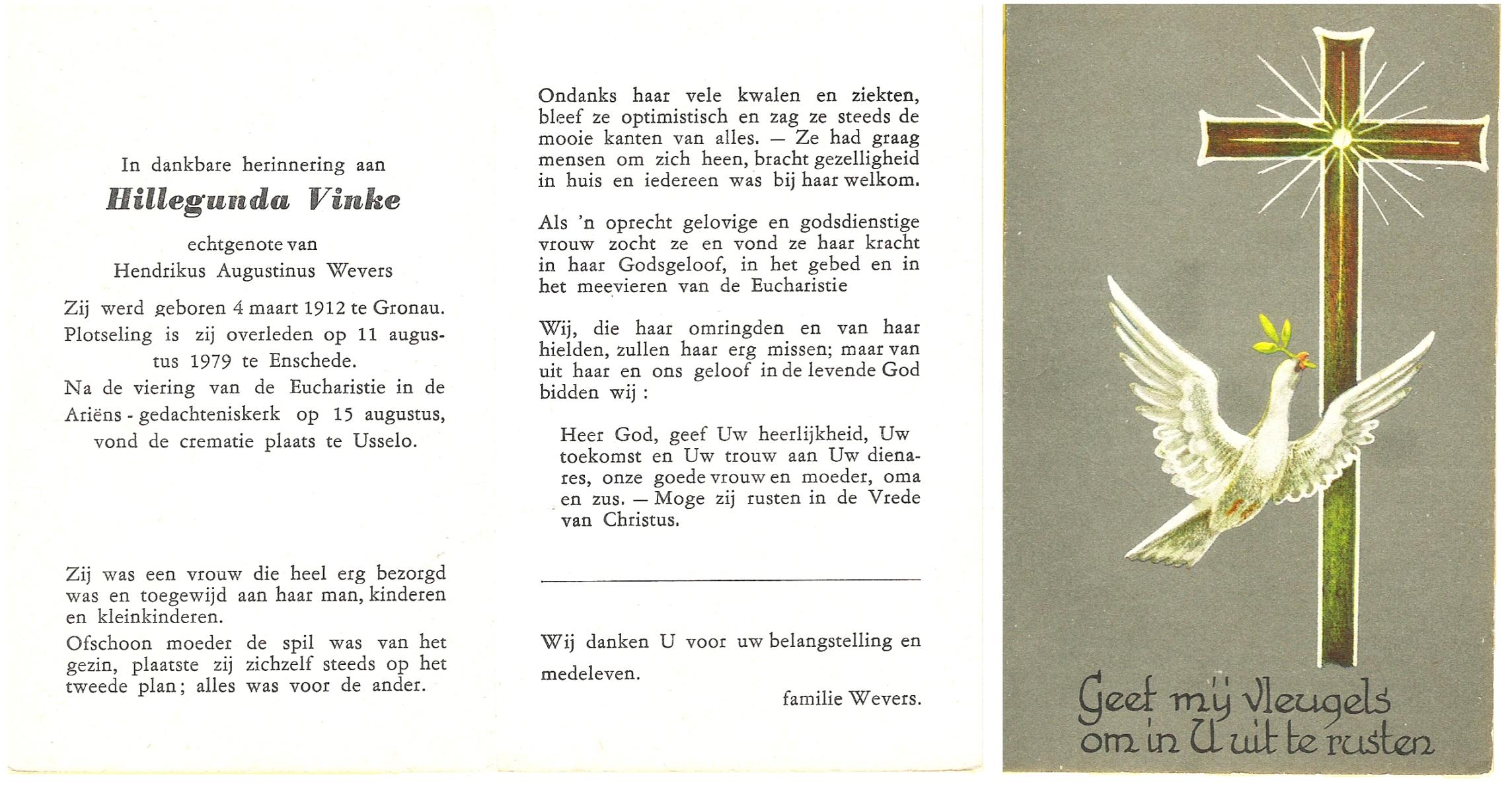 VINKE, Hillegunda, geboren op 4-3-1912 te Gronau (Dld.), overleden op 11-8-1979 te Enschede op 67-jarige leeftijd, gecremeerd op 15-8-1979 te Usselo.