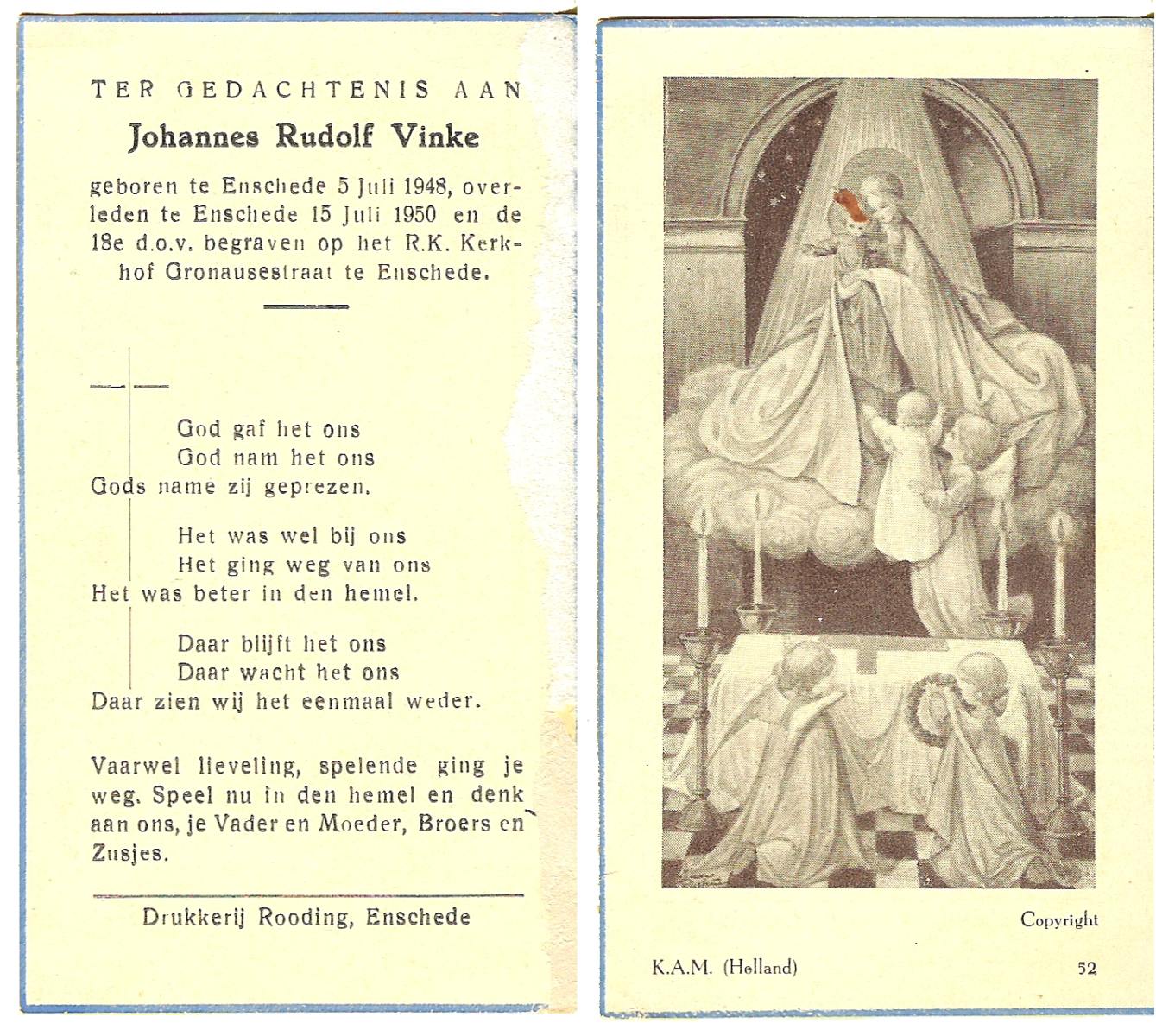 VINKE, Johannes Rudolf, geboren op 5-7-1948 te Enschede, overleden op 15-7-1950 te Enschede op 2-jarige leeftijd, begraven op 18-7-1950 te Enschede.