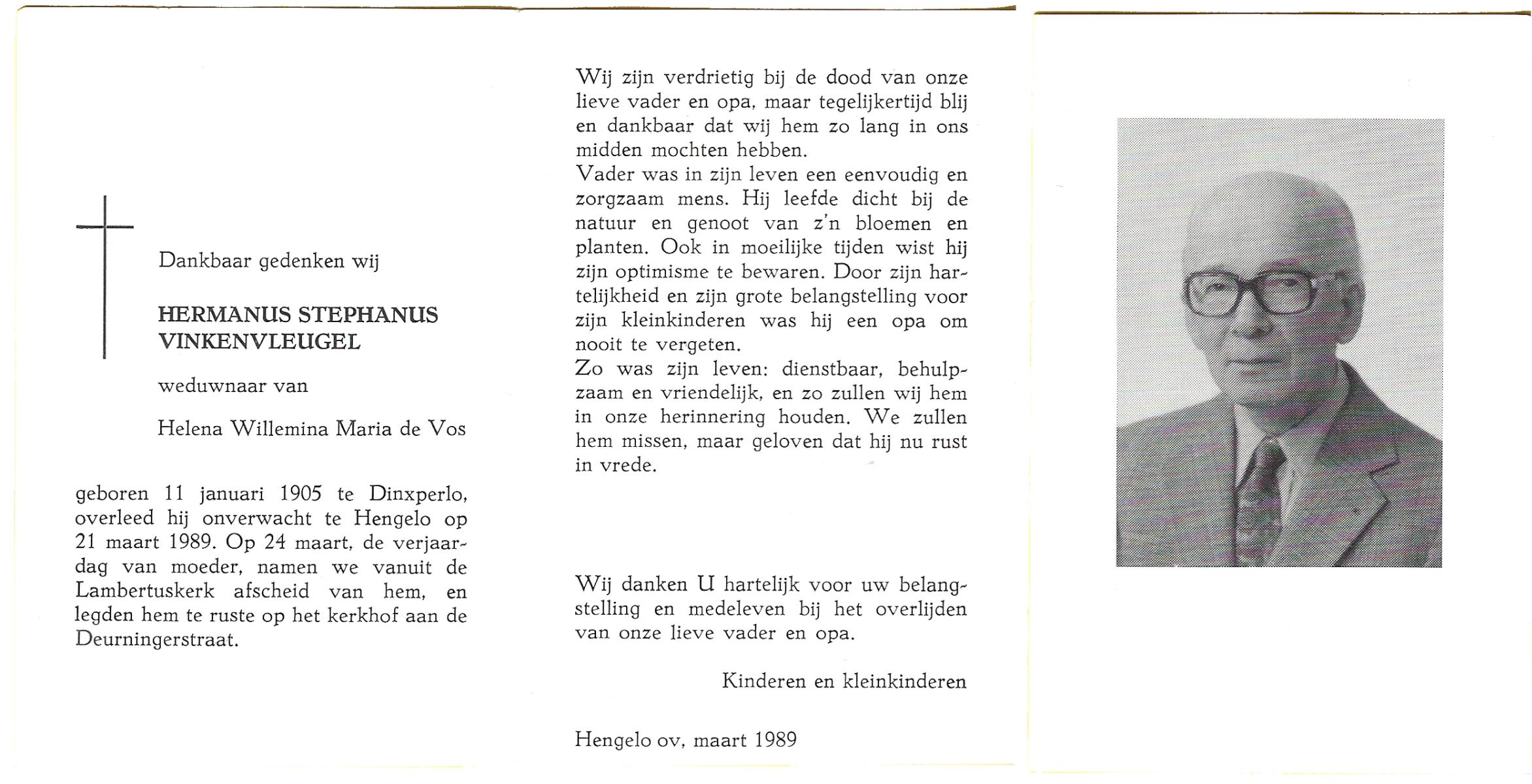 VINKENVLEUGEL, Hermanus Stephanus, geboren op 11-1-1905 te Deurningen, overleden op 21-3-1989 te Hengelo (Ov.) op 84-jarige leeftijd, begraven te Hengelo (Ov.).