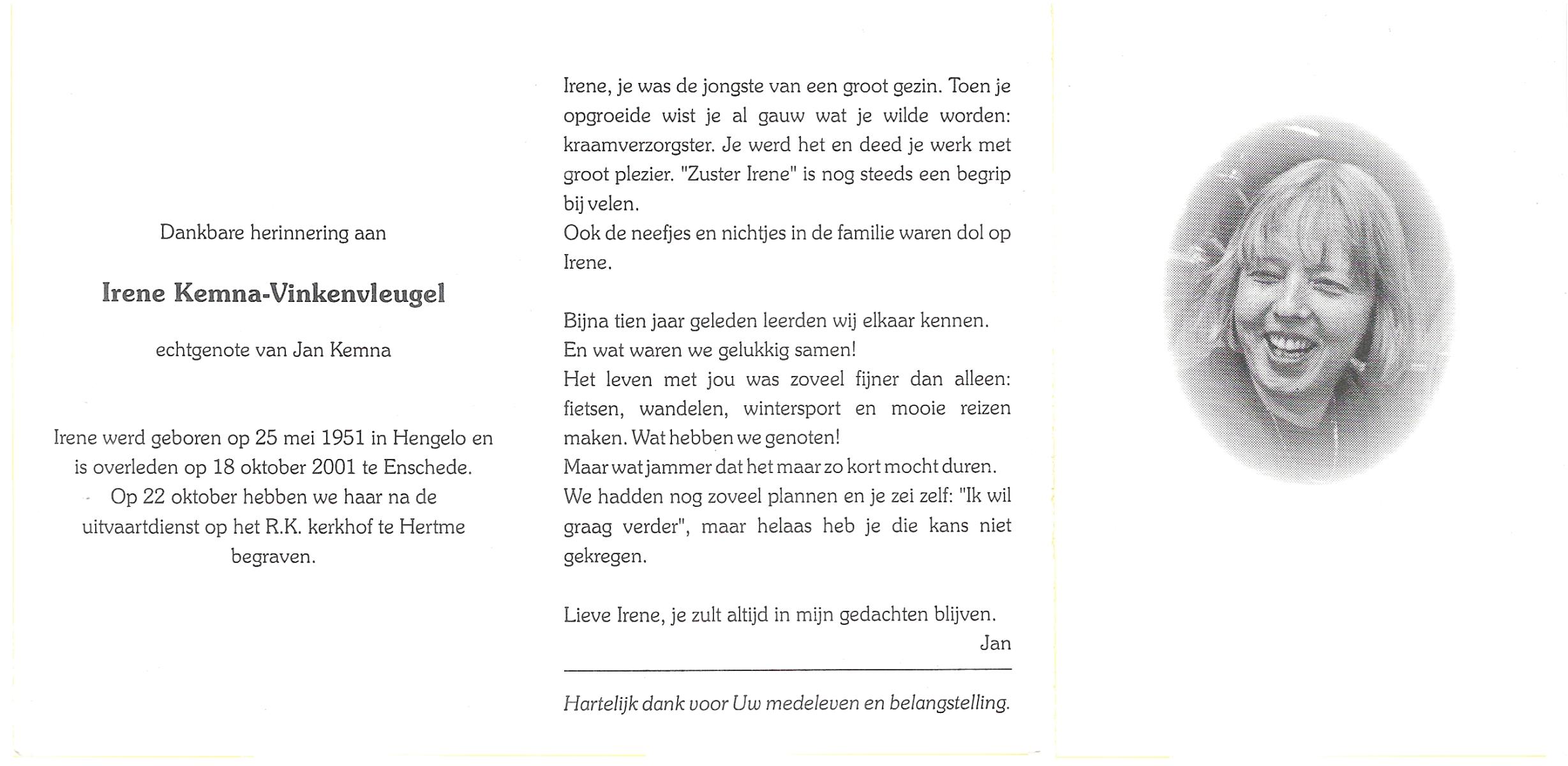 VINKENVLEUGEL, Irene, geboren op 25-5-1951 te Hengelo (O), overleden op 18-10-2001 te Enschede op 50-jarige leeftijd, begraven op 22-10-2001 te Hertme.