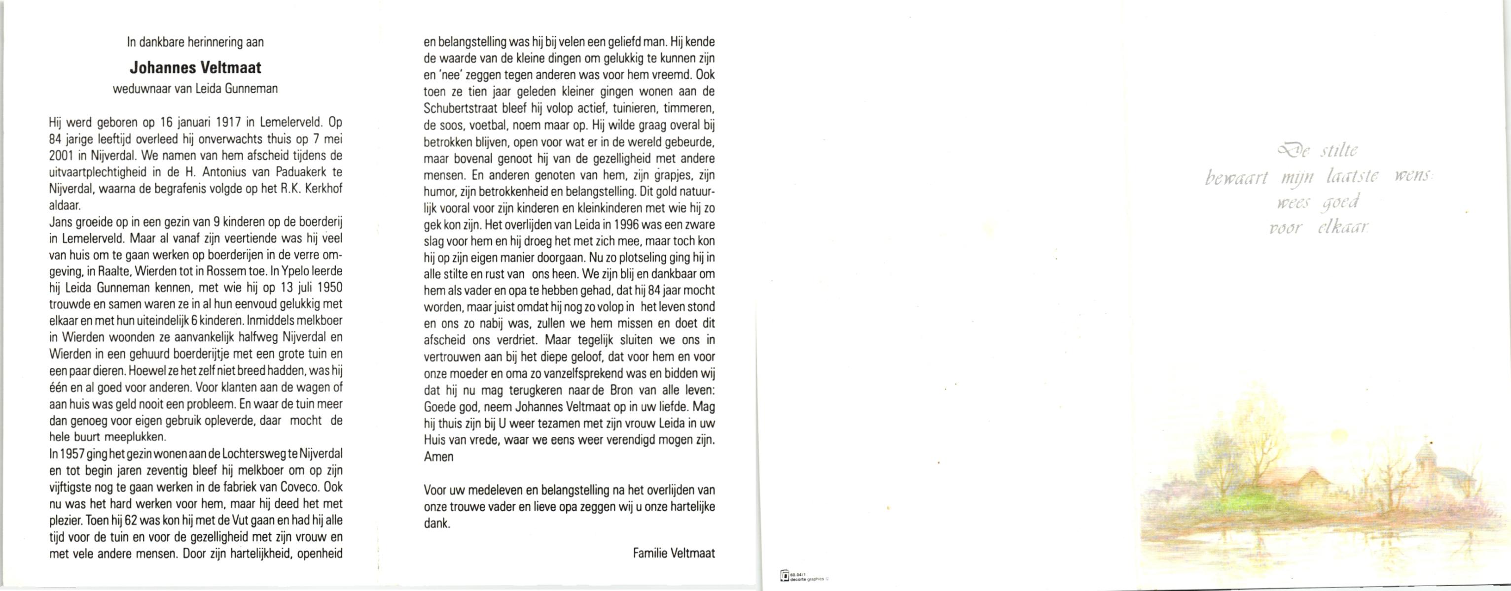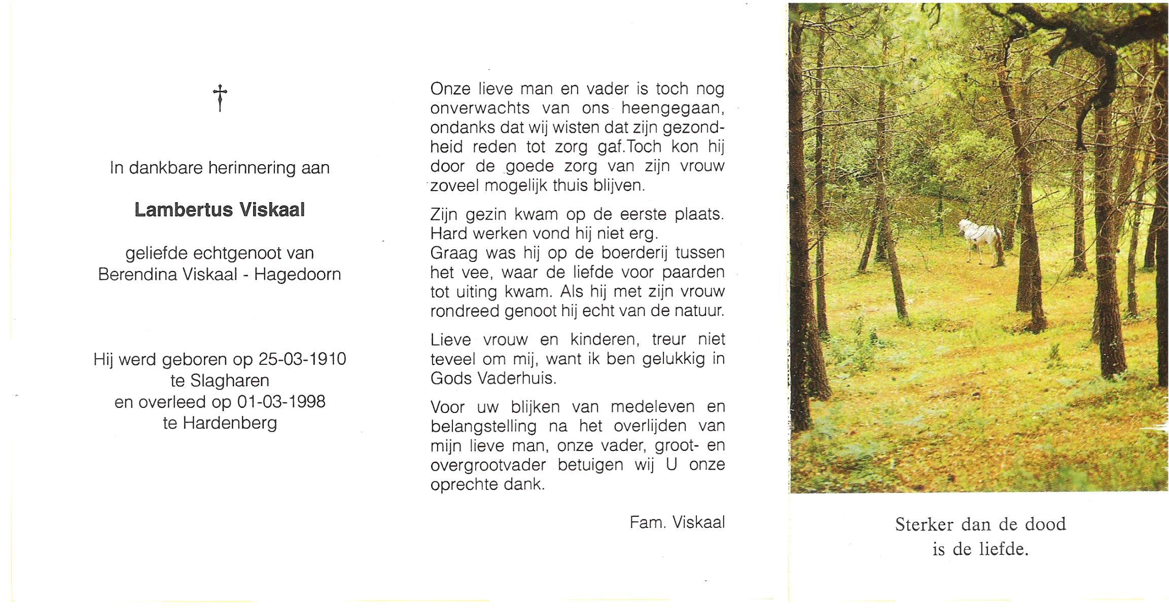 VISKAAL, Lambertus, geboren op 25-3-1910 te Slagharen, overleden op 1-3-1998 te Hardenberg op 87-jarige leeftijd.