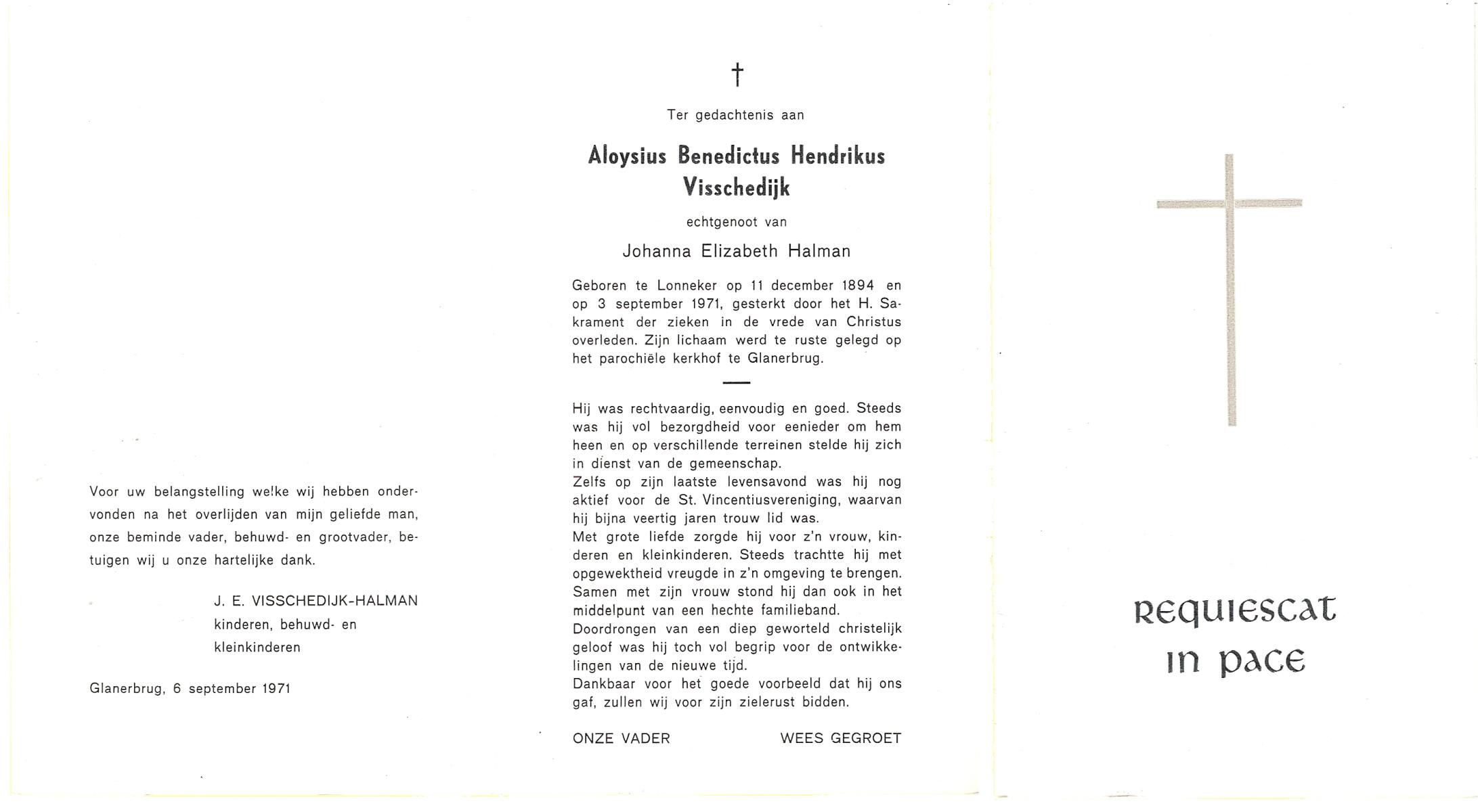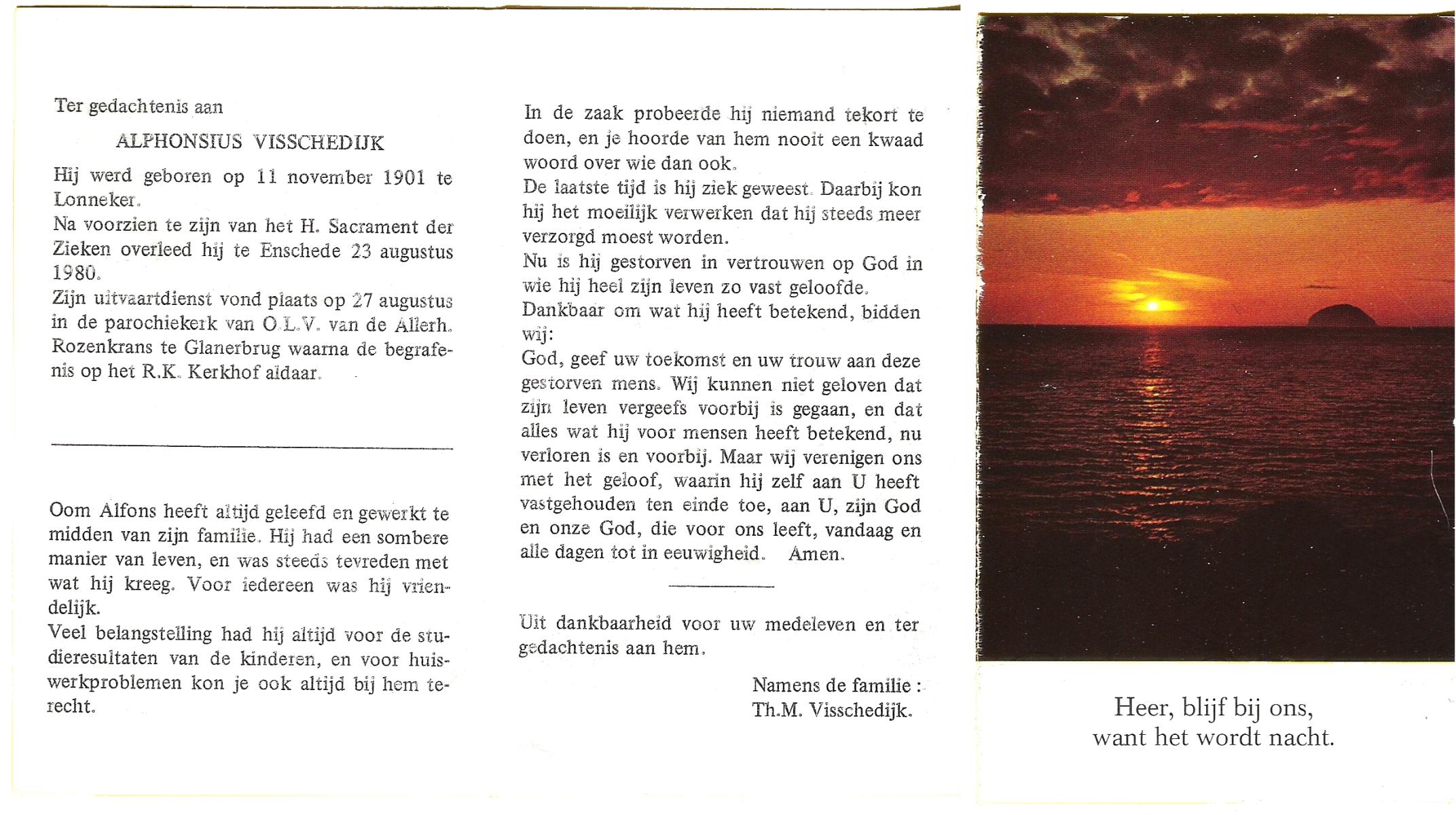 VISSCHEDIJK, Alphonsus, geboren op 11-11-1901 te Lonneker, overleden op 23-8-1980 te Enschede op 78-jarige leeftijd, begraven op 27-8-1980 te Glanerbrug.
