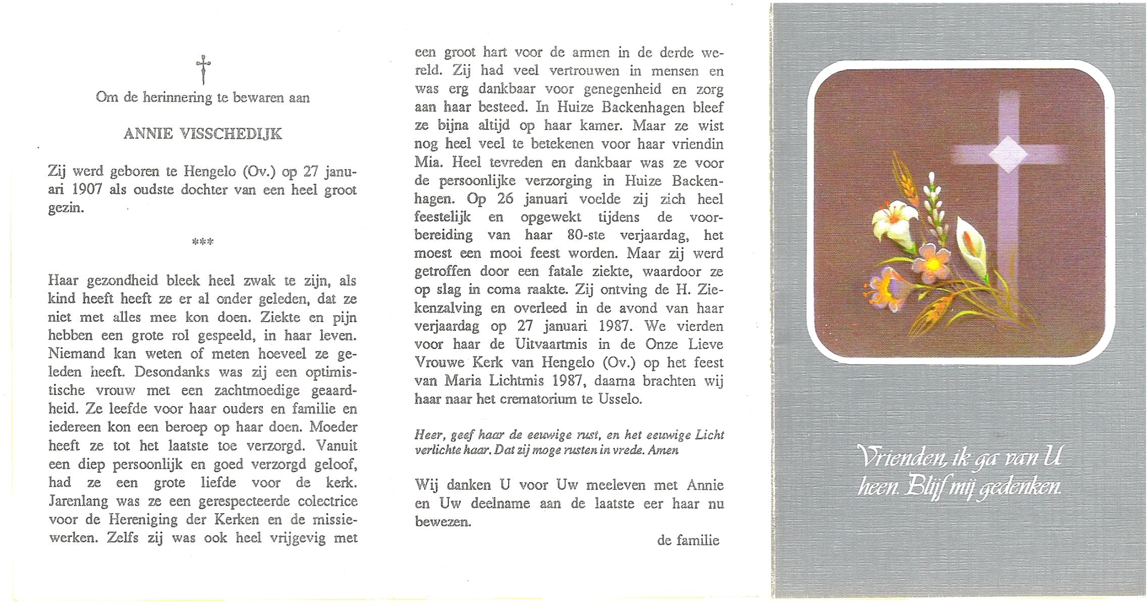VISSCHEDIJK, Annie, geboren op 27-1-1907 te Hengelo (O), overleden op 27-1-1987 op 80-jarige leeftijd, gecremeerd te Usselo.