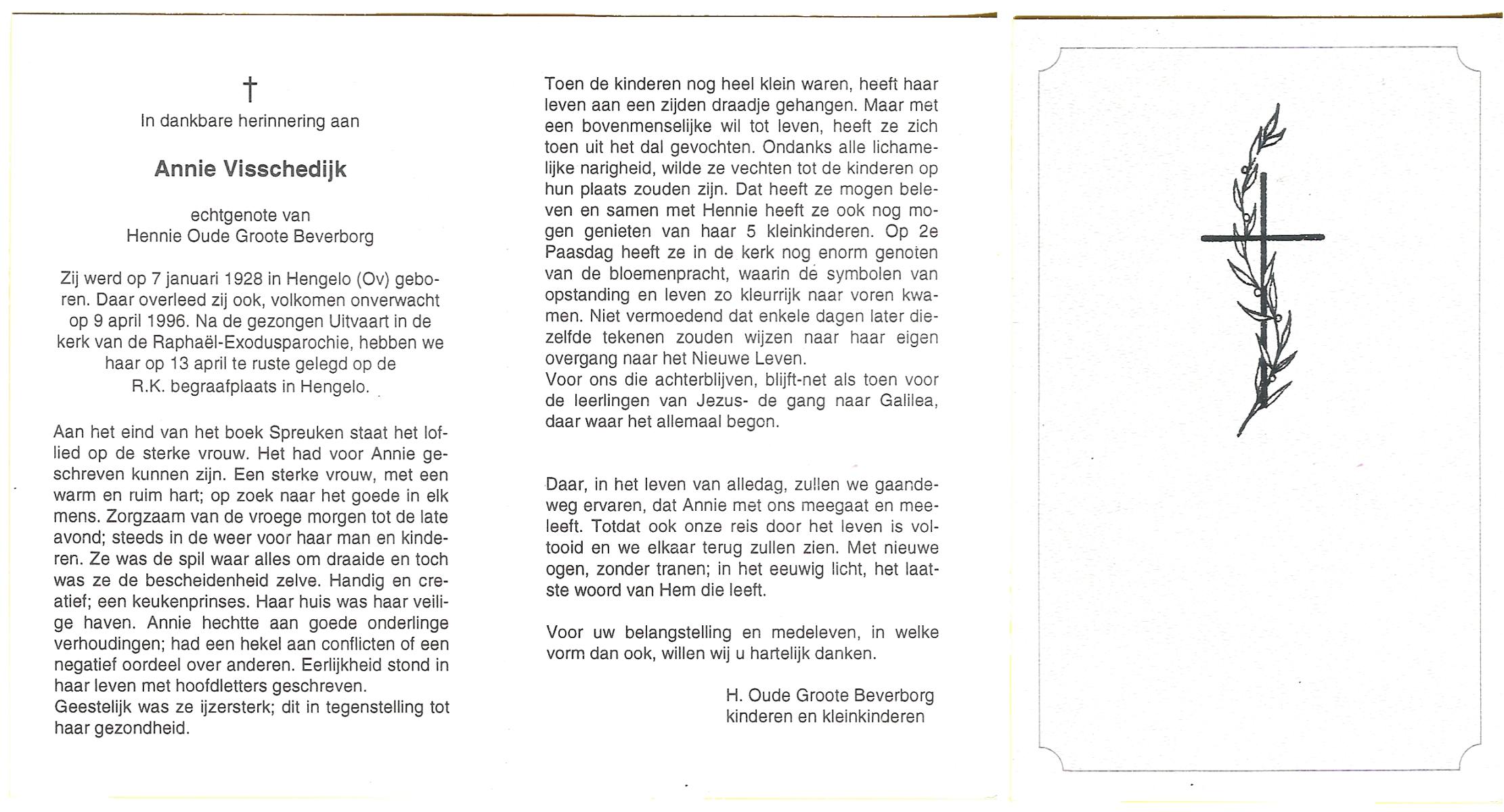VISSCHEDIJK, Annie, geboren op 7-1-1928 te Hengelo (O), overleden op 9-4-1996 te Hengelo (Ov.) op 68-jarige leeftijd, begraven op 13-4-1996 te Hengelo (Ov.).