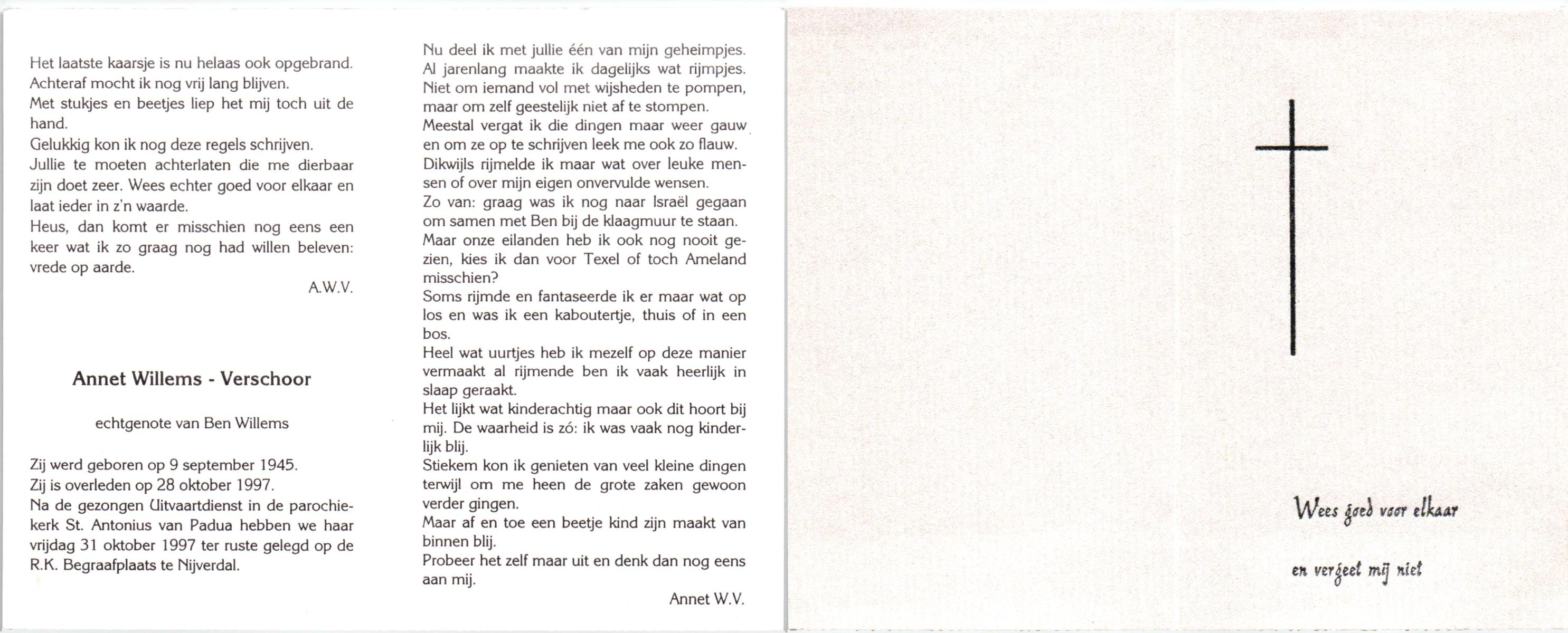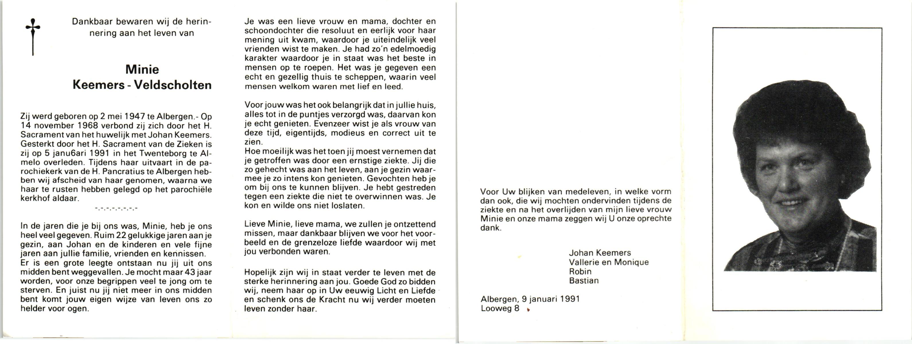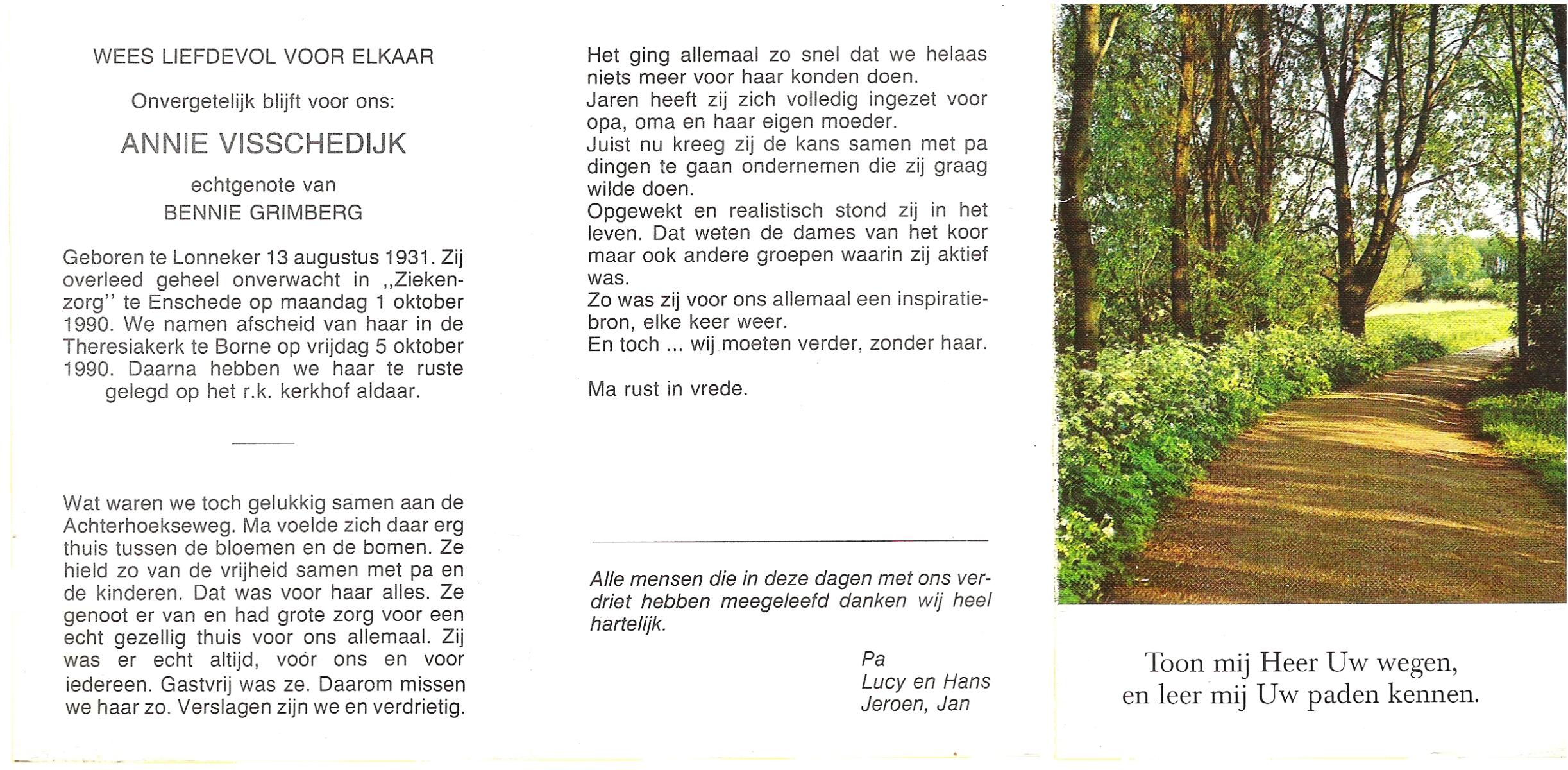 VISSCHEDIJK, Annie, geboren op 13-8-1931 te Lonneker, overleden op 1-10-1990 te Enschede op 59-jarige leeftijd, begraven op 5-10-1990 te Borne.