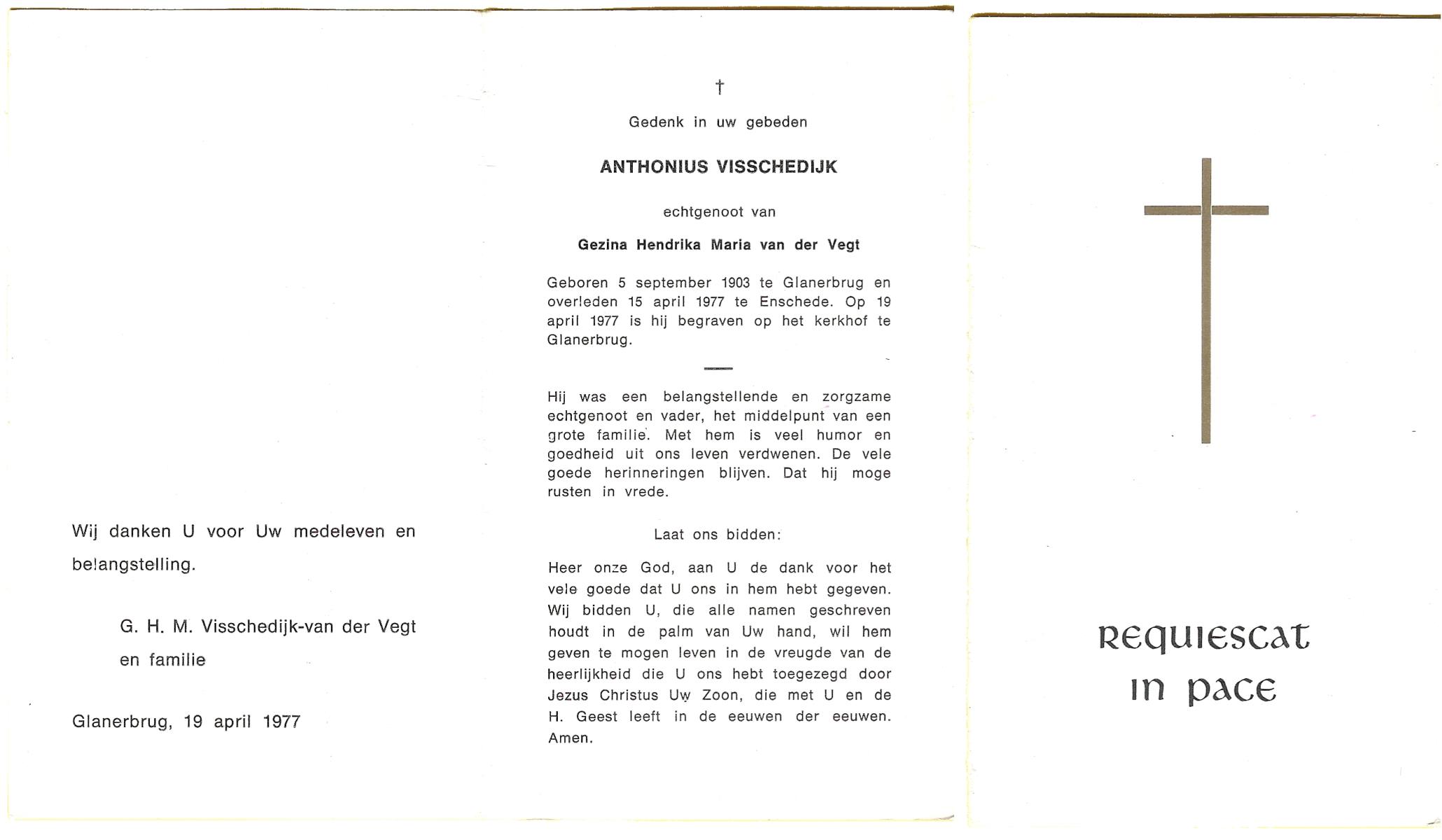 VISSCHEDIJK, Anthonius, geboren op 15-9-1903 te Glanerbrug, overleden op 15-4-1977 te Enschede op 73-jarige leeftijd, begraven op 18-4-1977 te Glanerbrug.