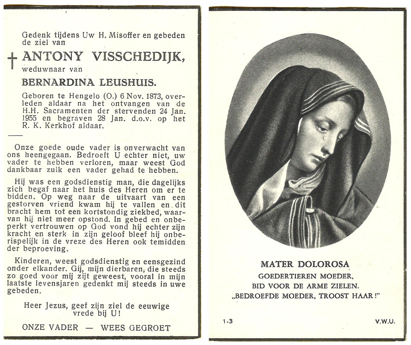VISSCHEDIJK, Antony, geboren op 06-11-1873 te Hengelo (O), overleden op 24-1-1955 te Hengelo (Ov.) op 81-jarige leeftijd, begraven op 28-1-1955 te Hengelo (Ov.).