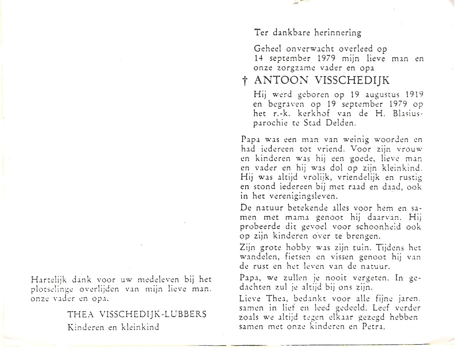 VISSCHEDIJK, Antoon, geboren op 19-8-1919, overleden op 14-9-1979 op 60-jarige leeftijd, begraven op 19-9-1979 te Delden, Stad.