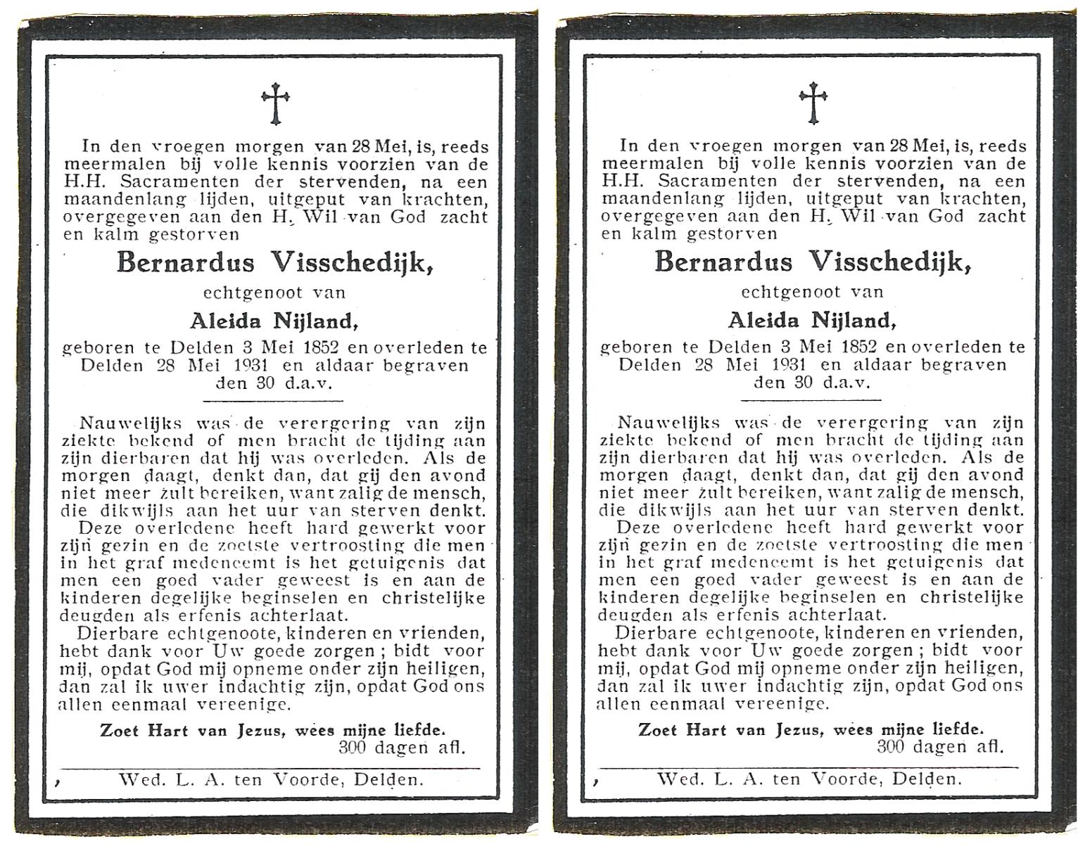 VISSCHEDIJK, Bernardus, geboren op 03-05-1852 te Delden, overleden op 28-5-1931 te Delden op 79-jarige leeftijd, begraven op 30-5-1931 te Delden.
